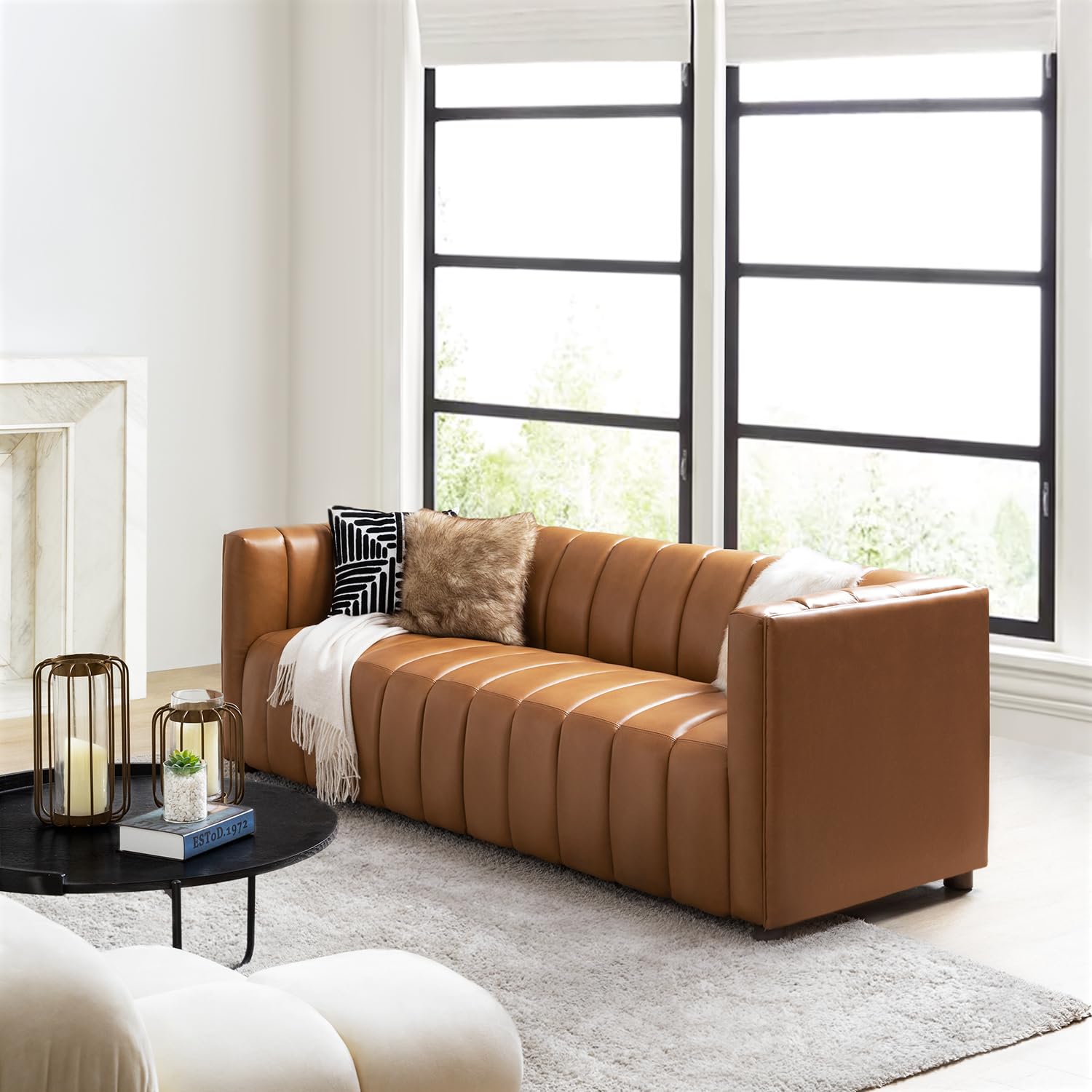 - MID-CENTURY LEATHER UPHOLSTERED COUCH: Modern Top layer leather couch, comfortable and easy to clean. Seat cushions filled with high resilience foam and linen fabric wadding provide comfortable support for you. The slender shape and channel-tufted upholstery are unmistakably mid-century, while soft leather and wooden frame bring contemporary elegance. This piece is a stunning style statement for glam, modern and mid-century rooms.