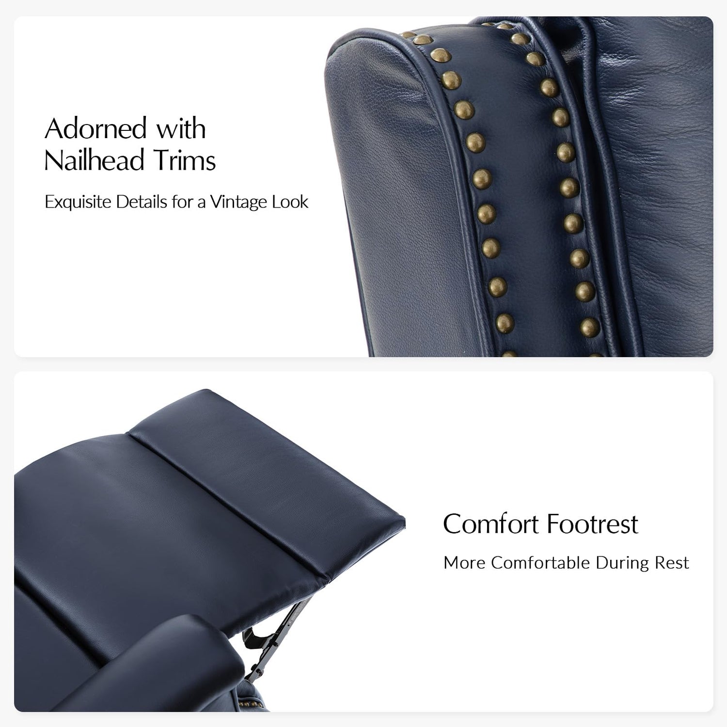 HULALA HOME Genuine Leather Recliner Chair, 360 Swivel Rocker Chair with Thick Seat, Classic Push Back Armchair with Backrest, Nailhead Trim, Navy