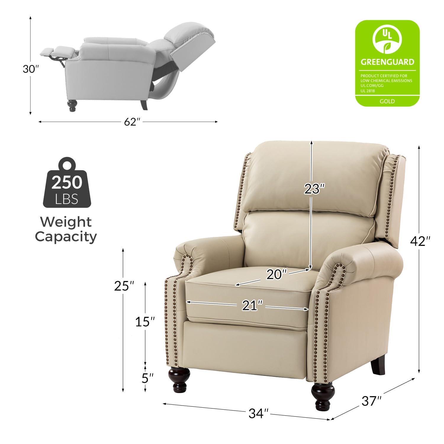 - Mid Century Recliner:Adjust the backrest to 108 or 140 degrees for comfortable TV watching or relaxing. Paired with a footrest, it's ideal for the living room or home theater. Dimensions: 34"Wx37"Dx42"H, Seat: 21"Wx20"Dx20"H. Features a classic design with stylish round armrests adorned with rivet detailing for added flair. Enhance your home's style and enjoy leisure time in this generously designed recliner.