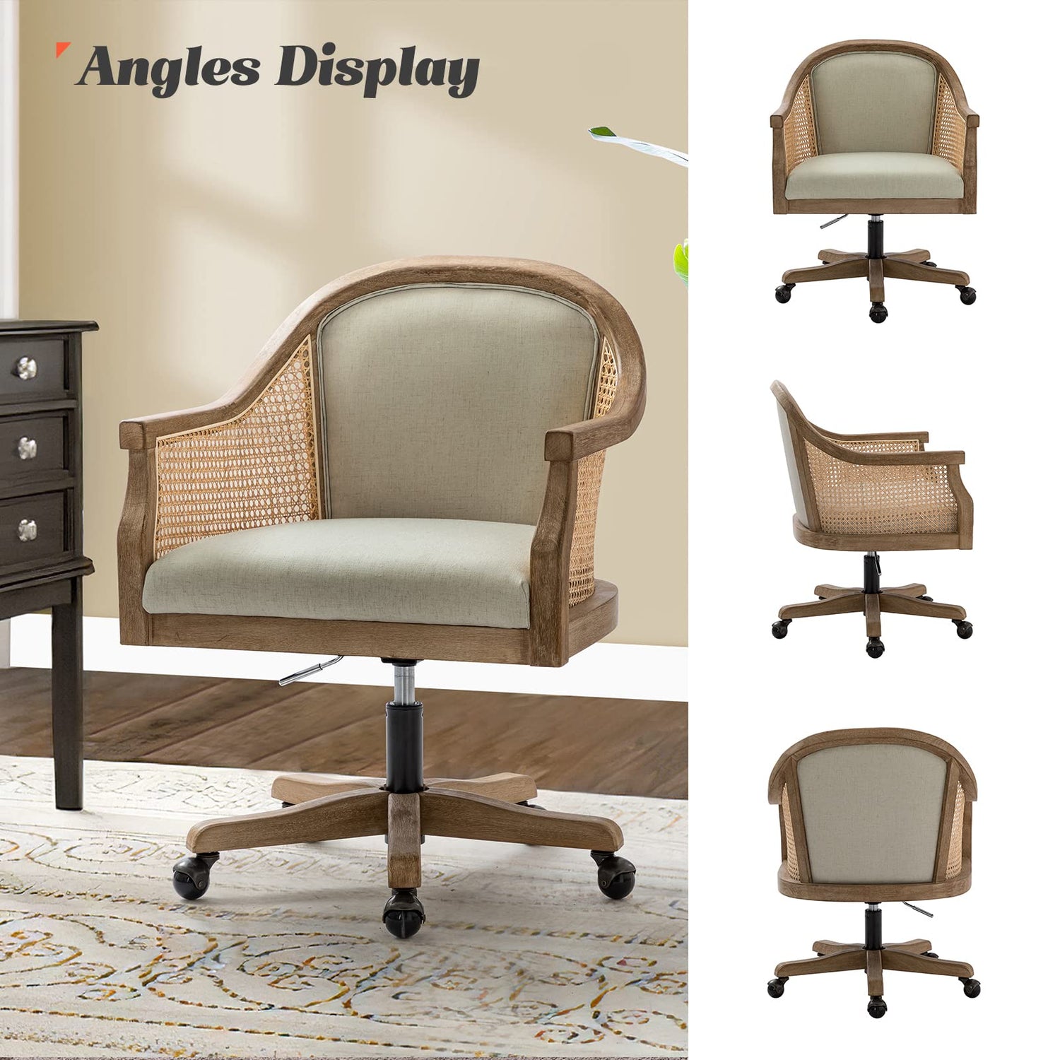 HULALA HOME Rattan Desk Chair, Upholstered Home Office Chair, Vintage Office Chair with Armrest, Adjustable Swivel Rolling Height Task Chair for Living Room Bedroom Study Room, Linen
