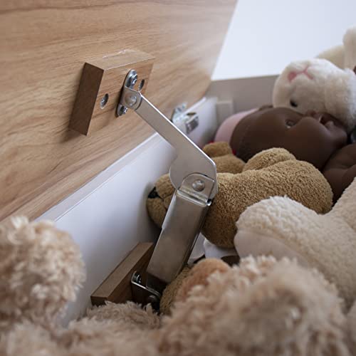 - Large toy box features a deep, easy-to-access storage compartment with hinged lid equipped with safety-close engineering.