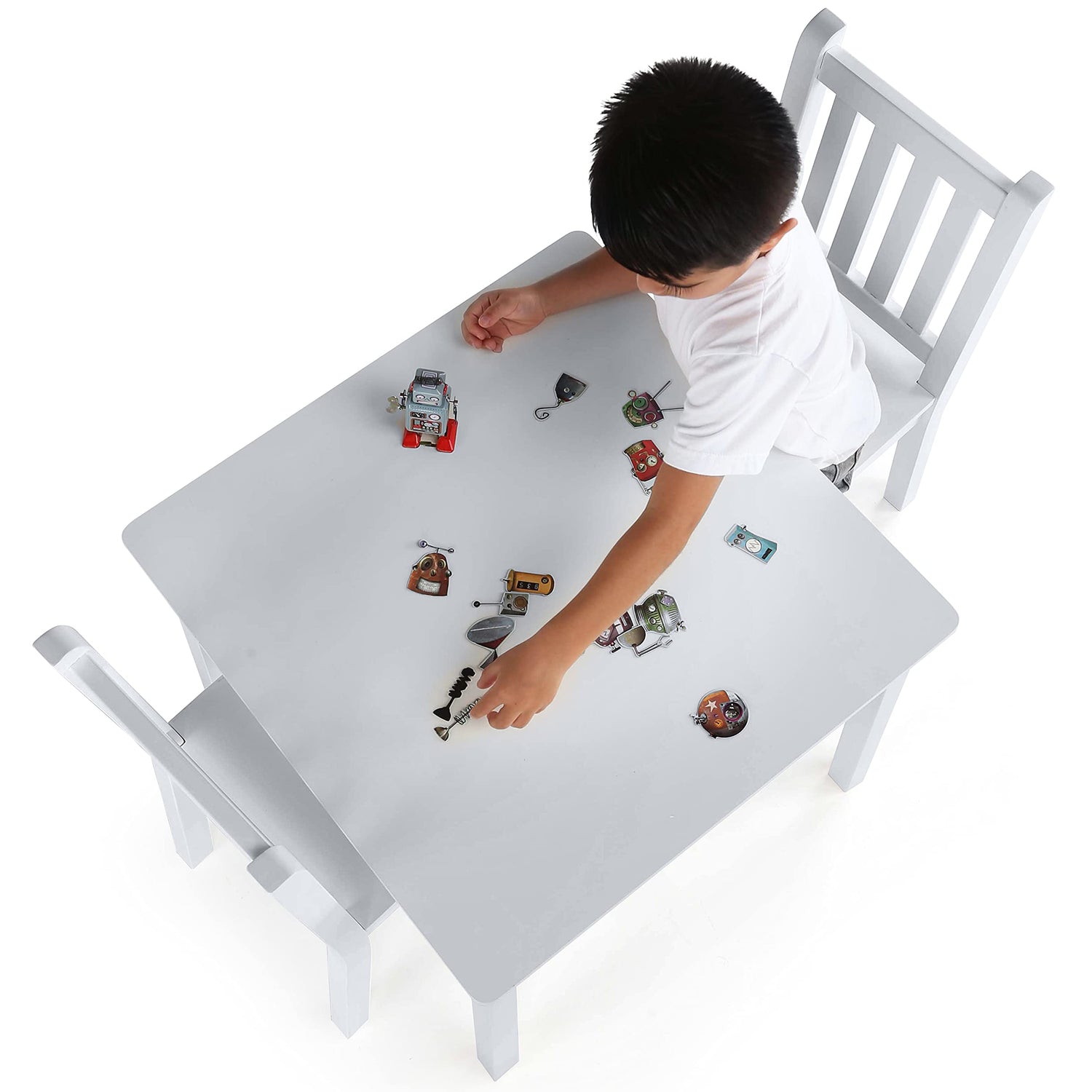 - Sturdy engineered wood 3-piece set, 1 kid's table and 2 chairs.