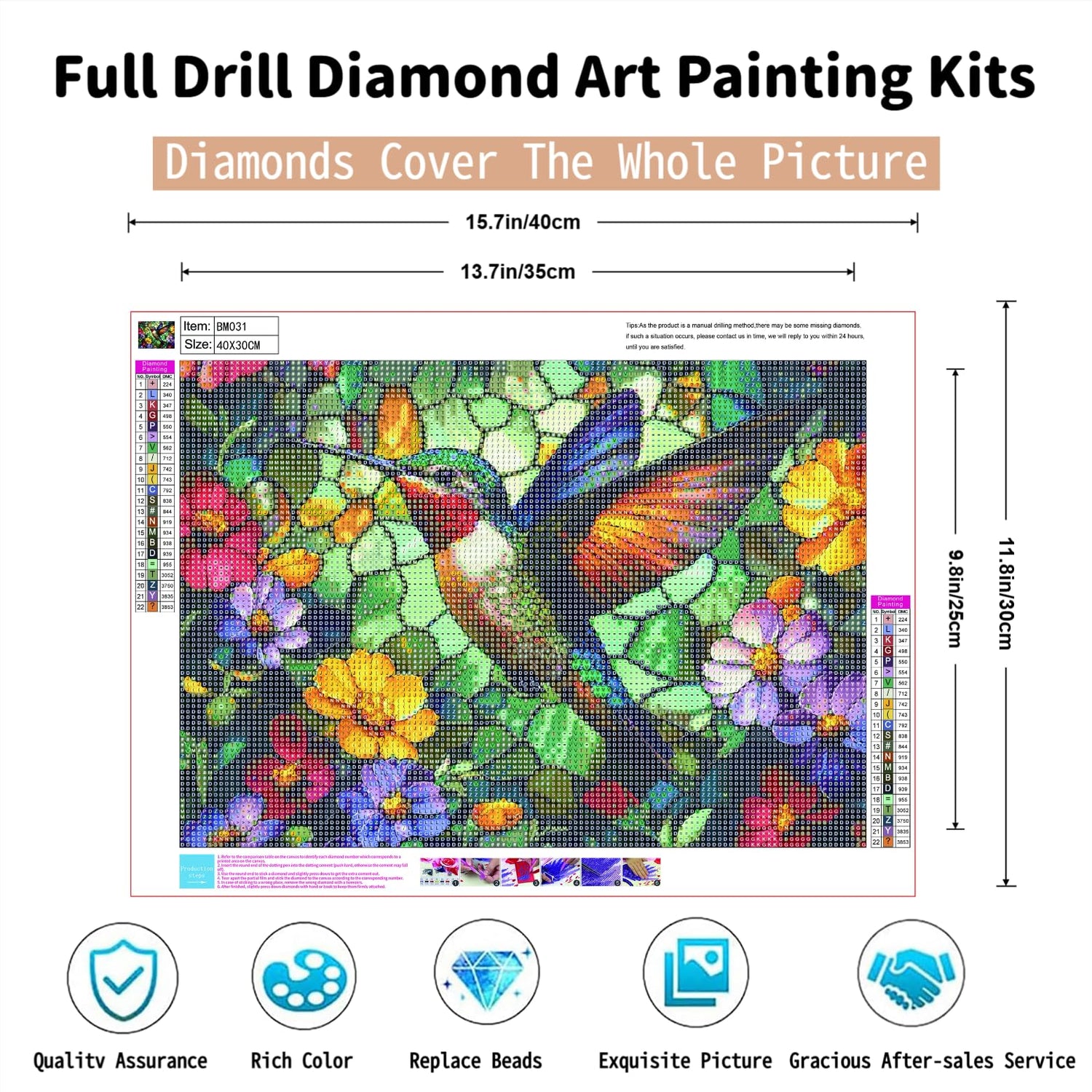 - Due to high demand, we sold out quickly. New stock is arriving soon—act fast as quantity may be limited. Stained Glass Hummingbird Diamond Art Kits for Adults: This diamond painting kit features a stunning stained-glass style hummingbird surrounded by multicolored flowers, creating a dazzling visual effect that adds artistic flair to any room. Perfect for hummingbird wall art decor, it captures the beauty of nature in a vibrant, eye-catching display.