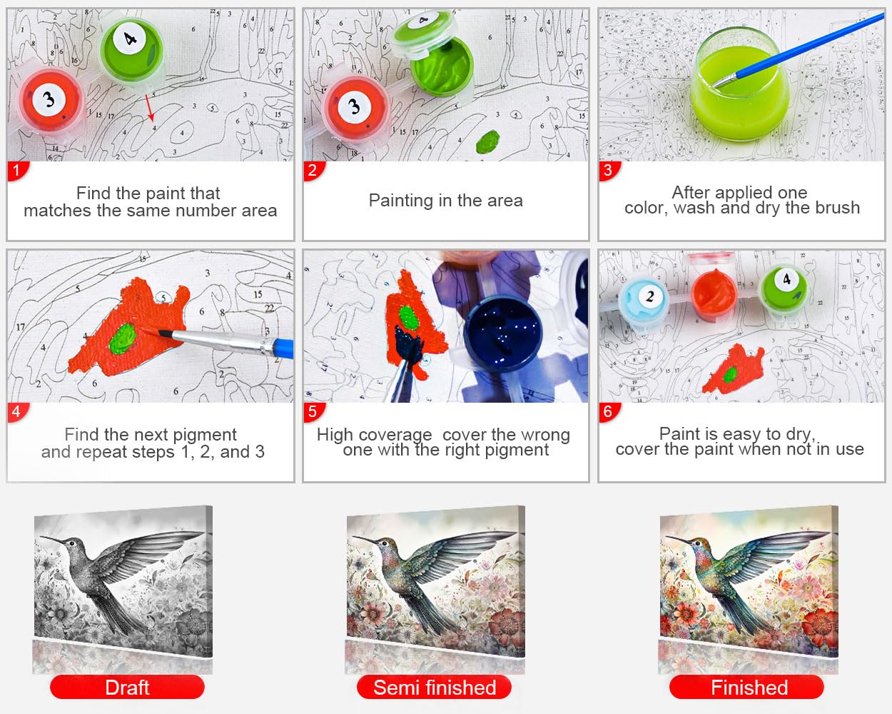 - Easy To Be A Painter: Paintings are simple and easy to draw, and can be easily handled by teenager, adults, and the elderly. Two easy steps to complete a painting, first: dip the paint. Second: paint the corresponding numbers on the canvas