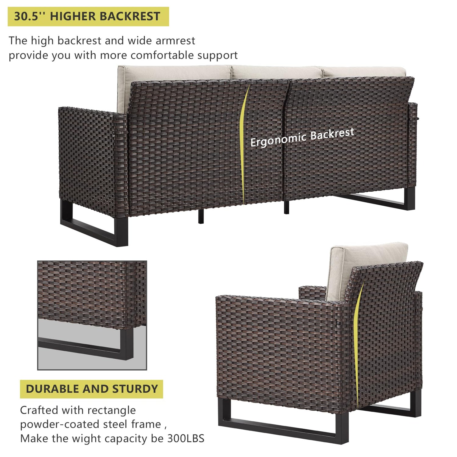 - 【Exquisite and Ergonomic Design】The patio conversation sets is totally upgraded with straight armrest and the heightened ergonomically curved backrest. Allow your back to lean back slightly,The height of patio couch is increased to 30.3 inch,more suitable for American family, Providing more comfortable seating experience,The overall design is more elegant and comfortable.