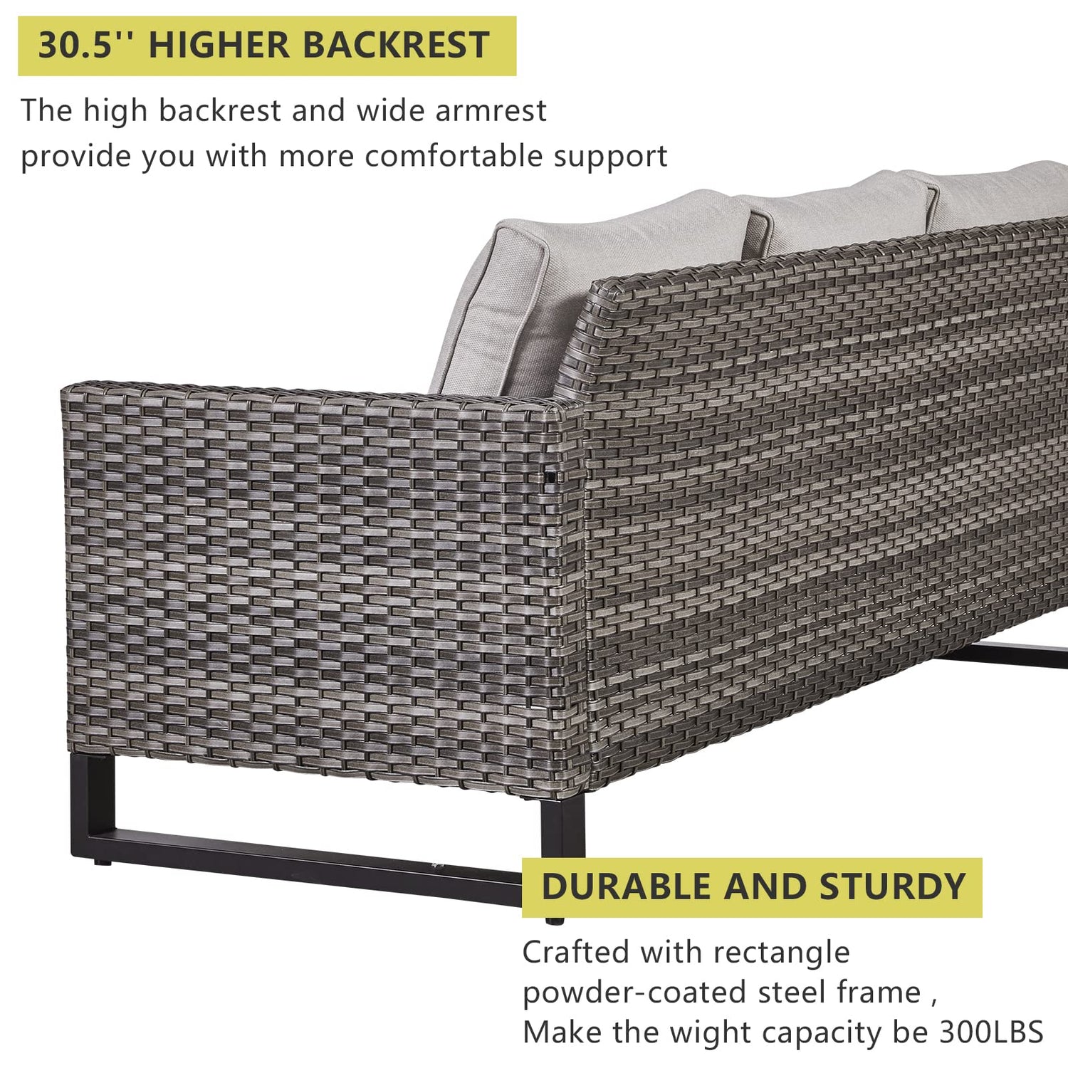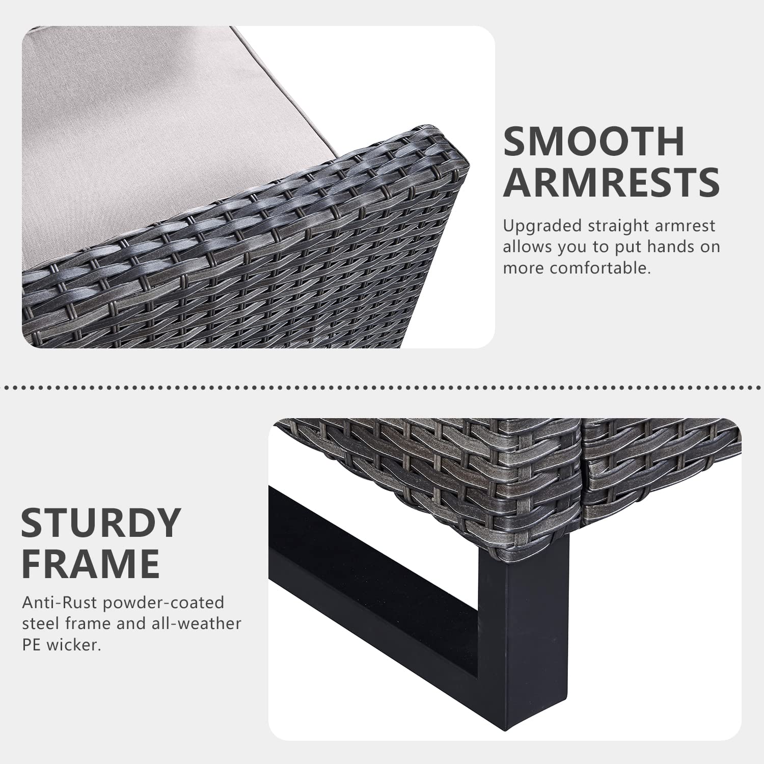- 【Upgrated Elegant Design Sturdy&Durable】All made with Anti-Rust powder-coated steel frame and All-weather Hand-Woven PE wicker to make this patio furniture set is resistant to UV and weather,The patio conversation sets is totally upgraded with straight armrest and the heightened ergonomically curved backrest.