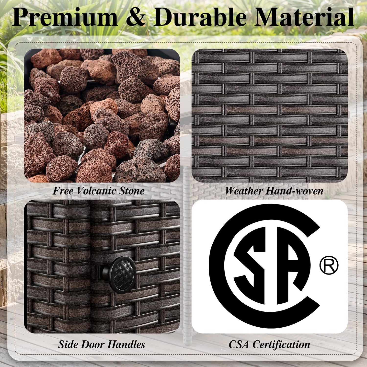 - Auto-ignition Fire Pit:The gas fire pit can reach up to 50,000 BTU heat output and is equipped with an integrated electronic ignition,It is CSA certified and undergo rigorous inspection and testing before leaving the factory to ensure reliability and safety.It can be used as a coffee table with the lid.
