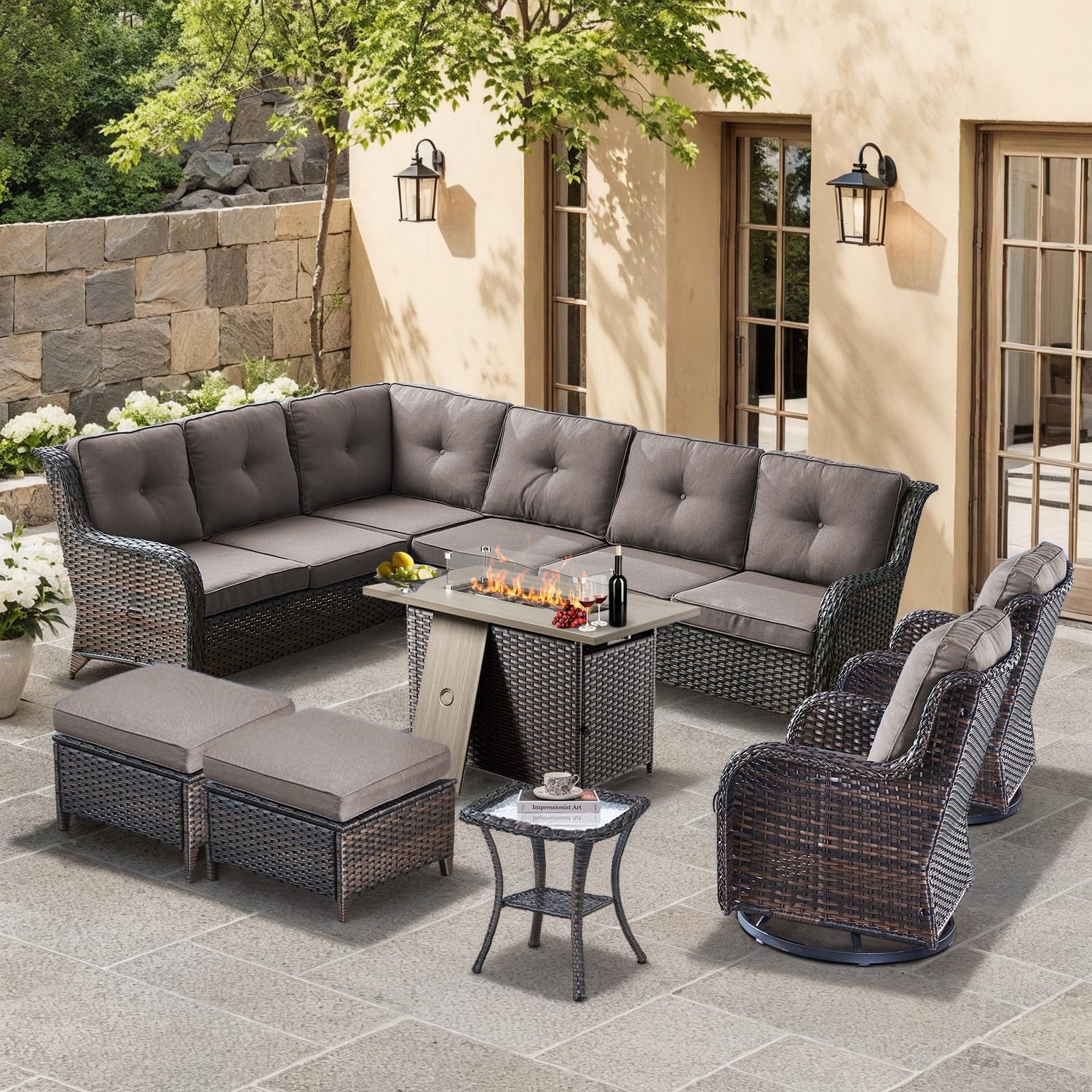 HUMMUH 8 Pieces Outdoor Patio Furniture Set with Fire Pit,L-Shaped Modular Sectional Couches with Swivel Patio Chairs,Wicker Conversation Set for Deck,Backyard,Porch,Garden
