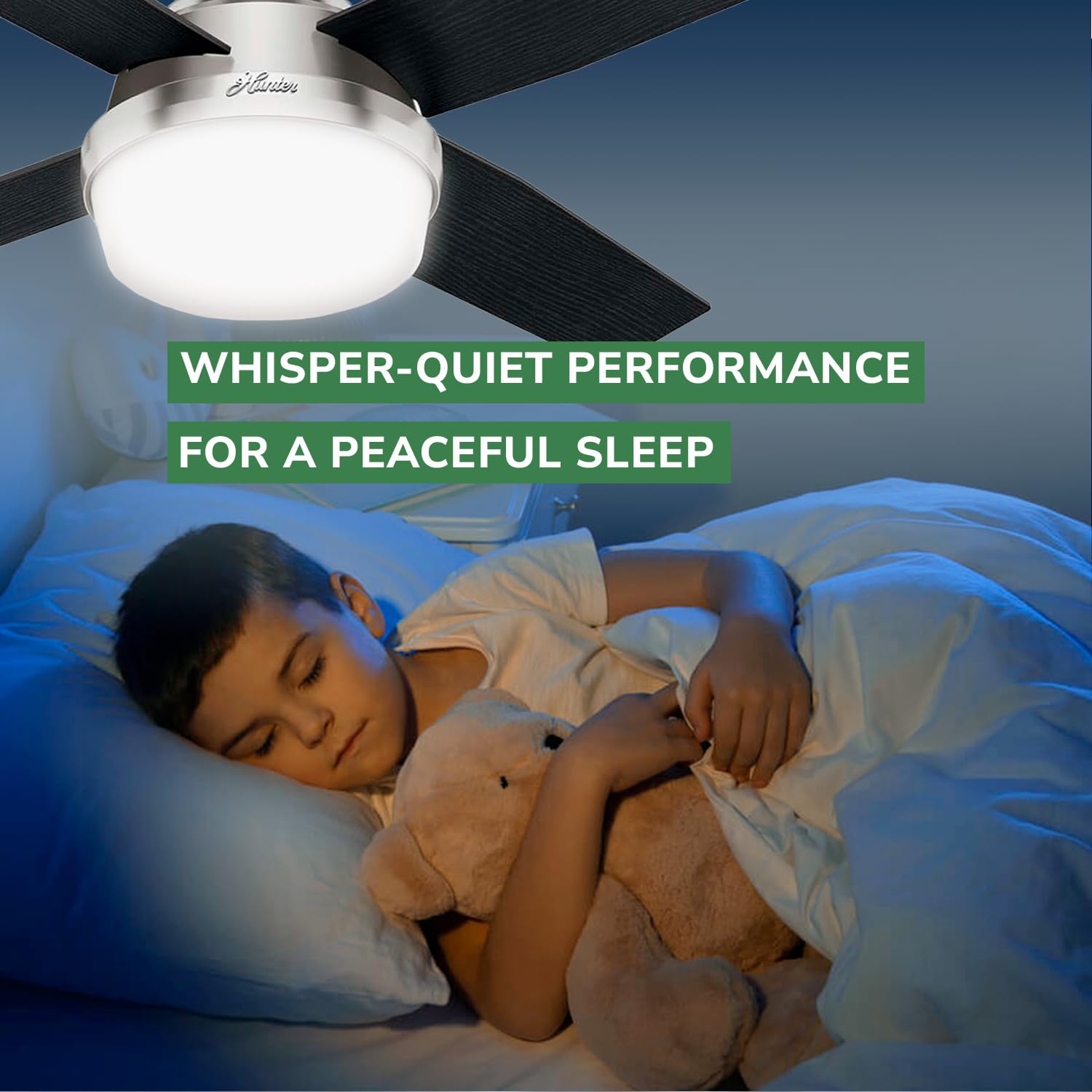 Details: The Hunter Fan Dempsey Low Profile Indoor Ceiling Fan with LED Light and Remote Control in Brushed Nickel Finish is the perfect addition to your modern home. This ultra low profile ceiling fan measures 44 x 44 x 11.03 inches and is powered by a WhisperWind® motor, delivering ultra-powerful airflow with whisper-quiet performance. The fan's direction can be easily switched from downdraft mode in summer to updraft mode in winter, ensuring comfort all year round. The integrated LED light kit, featuring energy-efficient, dimmable LED bulbs, allows you to easily control the lighting and ambiance of your living space. The ceiling fan with light and remote offers total convenience, letting you adjust the brightness and fan speed from anywhere in the room. Designed with a low-profile housing, this bedroom ceiling fan with lights fits flush to the ceiling, making it ideal for rooms with low ceilings. The clean finish and contemporary design will keep your home looking fresh and inspired. Perfect for various room placements, including living rooms, lounges, bedrooms, children's rooms, and nurseries. Additionally, this ceiling fan with light and remote is suitable for kitchen installations, offering versatility in both style and function. Optimize your home with the timeless appeal and functional efficiency of the Dempsey fan, a flush ceiling fan with lights that ensures ideal air movement and peak performance. Choose this ceiling fan with light and remote for your bedroom, kitchen, or any room where both form and function are paramount.