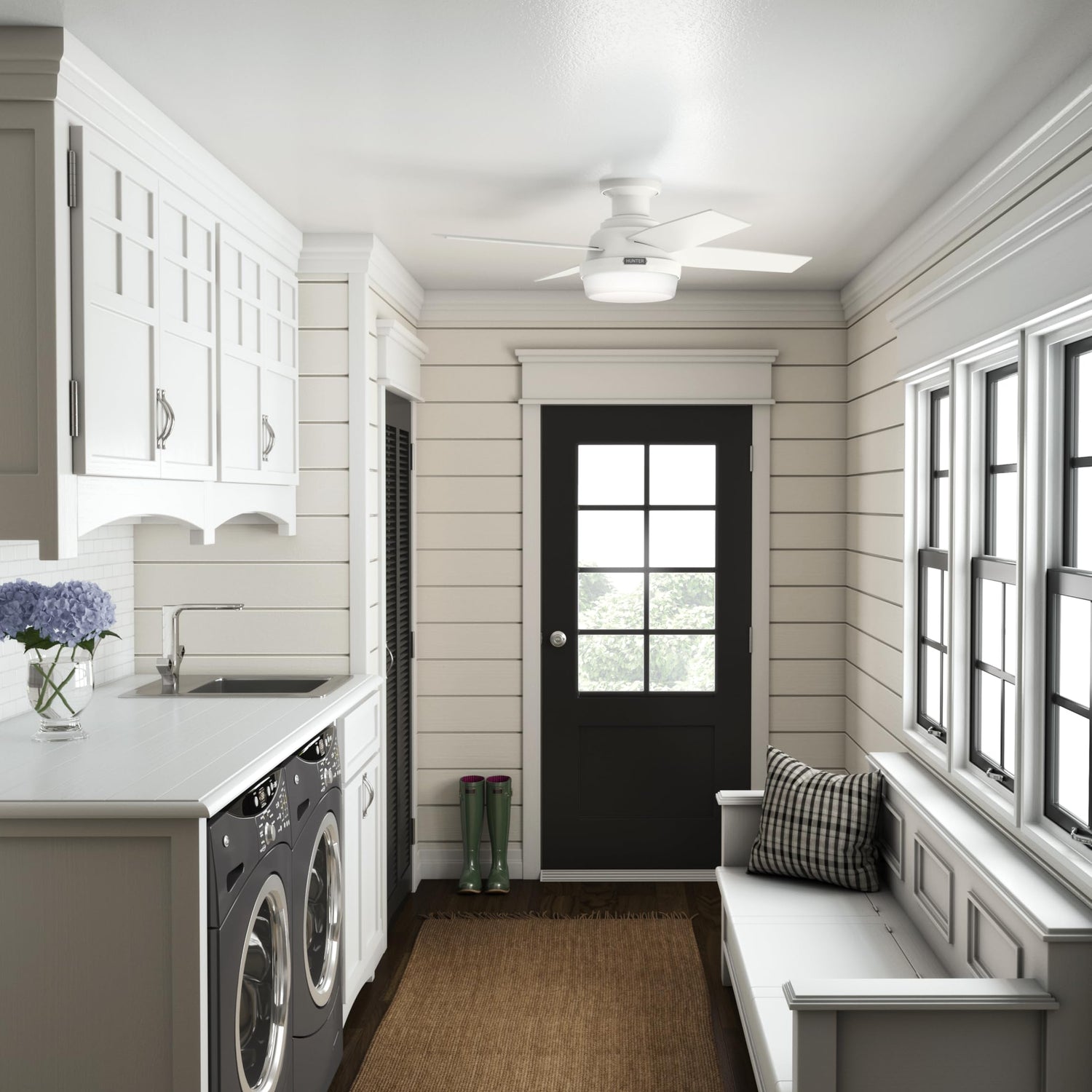 Details: The Hunter Fan Dempsey Low Profile Indoor Ceiling Fan with LED Light and Remote Control in Fresh White is the perfect addition to your modern home. This ultra low profile ceiling fan measures 44 x 44 x 11.03 inches and is powered by a WhisperWind® motor, delivering ultra-powerful airflow with whisper-quiet performance. The fan's direction can be easily switched from downdraft mode in summer to updraft mode in winter, ensuring comfort all year round. The integrated LED light kit, featuring energy-efficient, dimmable LED bulbs, allows you to easily control the lighting and ambiance of your living space. The ceiling fan with light and remote offers total convenience, letting you adjust the brightness and fan speed from anywhere in the room. Designed with a low-profile housing, this bedroom ceiling fan with lights fits flush to the ceiling, making it ideal for rooms with low ceilings. The clean finish and contemporary design will keep your home looking fresh and inspired. Perfect for various room placements, including living rooms, lounges, bedrooms, children's rooms, and nurseries. Additionally, this ceiling fan with light and remote is suitable for kitchen installations, offering versatility in both style and function. Optimize your home with the timeless appeal and functional efficiency of the Dempsey fan, a flush ceiling fan with lights that ensures ideal air movement and peak performance. Choose this ceiling fan with light and remote for your bedroom, kitchen, or any room where both form and function are paramount.
