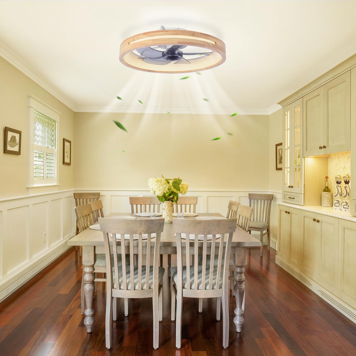 HUOGME Modern Low Profile Ceiling Fans with Lights and Remote, 20" Wooden Flush Mount Reversible Bladeless Ceiling Fans with Light,3000K-6000K Dimmable LED Timing and 6 Wind Speeds