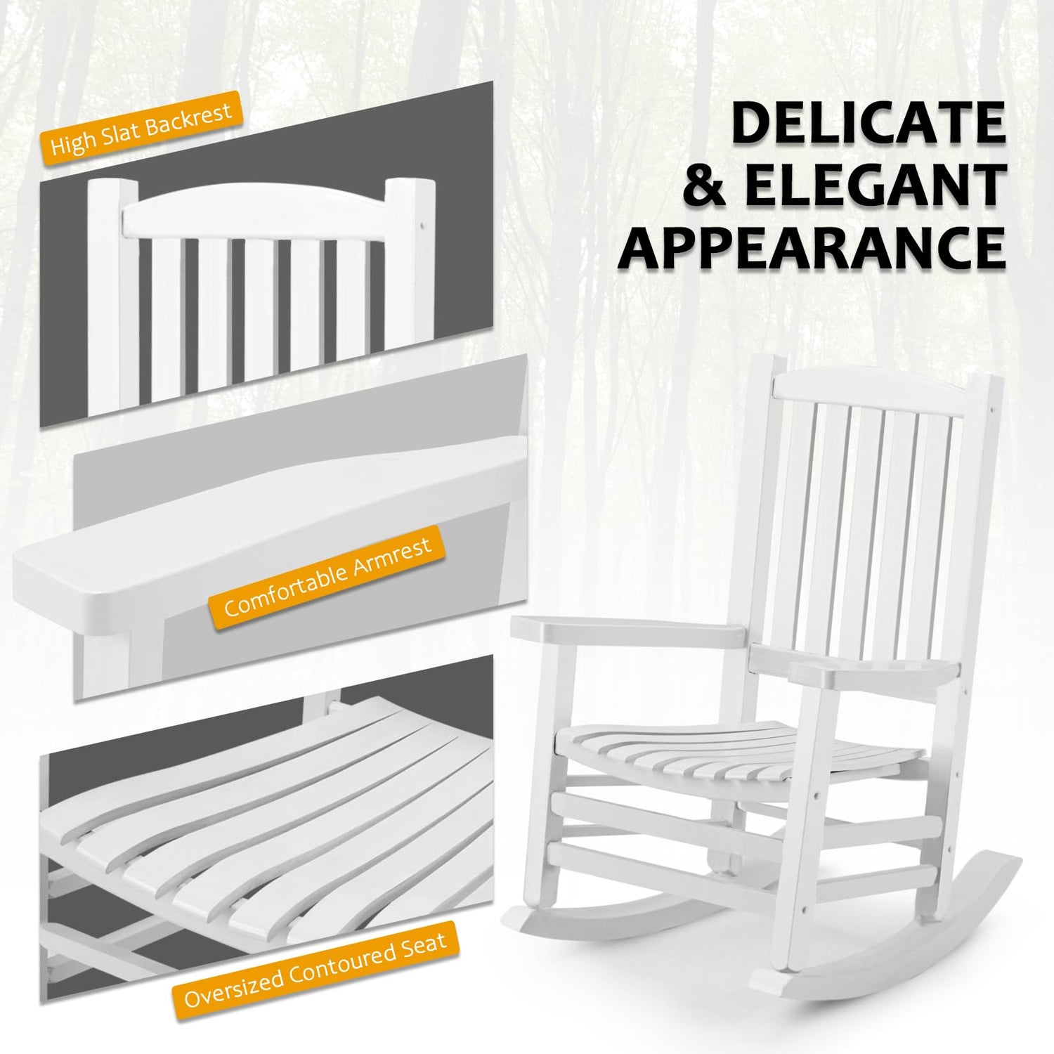 - CLASSIC & ELEGANT STYLE: This exquisite wood porch rocking chair exhibits simplicity and elegance with a contemporary style. Available in three color options, it can seamlessly blend into various home decors. You can position it anywhere indoors or outdoors, serving as an excellent companion for lounge areas such as living rooms, patios, courtyards, and nurseries. You can lounge and unwind in the sun, relish a comfortable leisure time, and add a touch of coziness to your living space