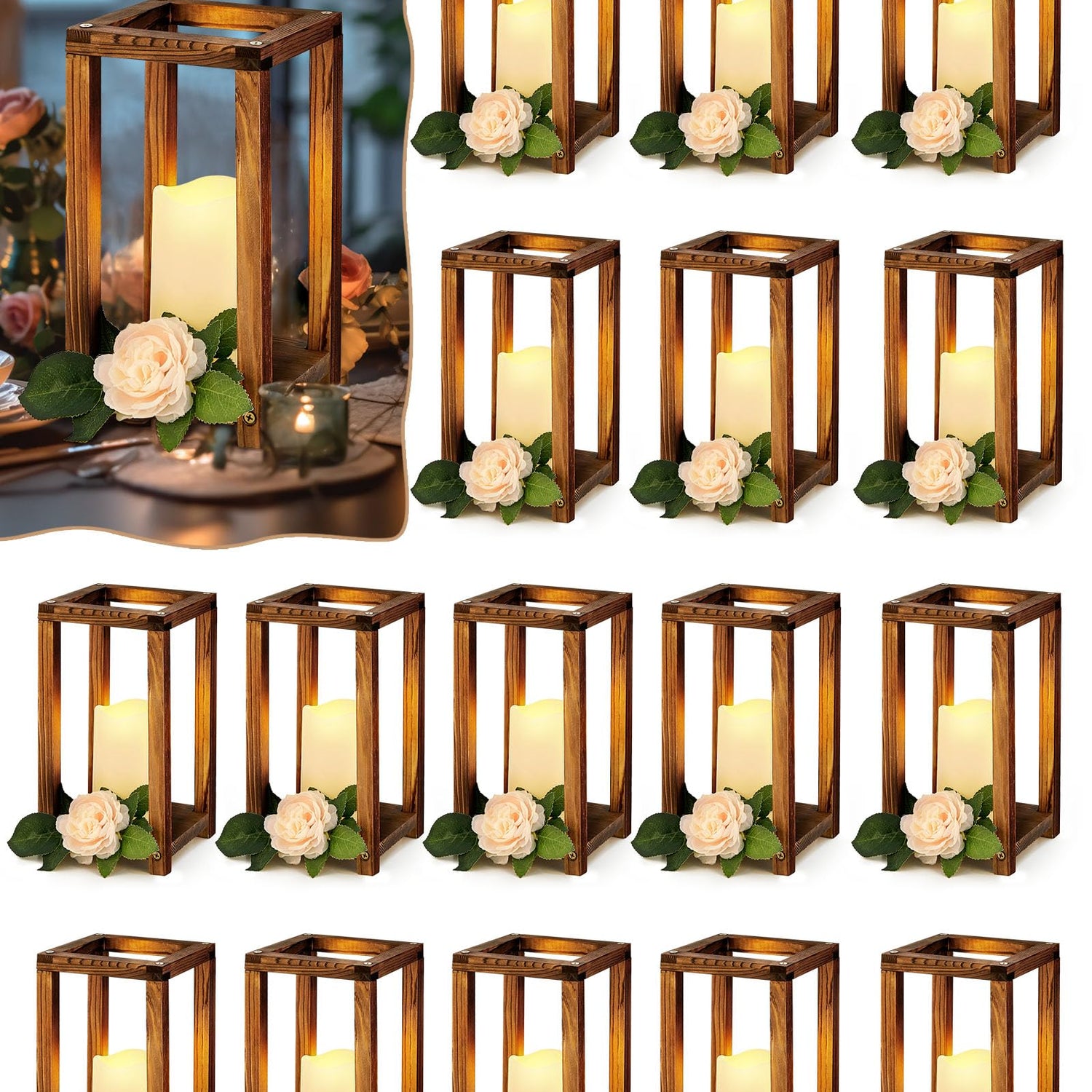 Huquary 32 Pcs Wooden Candle Lantern Bulk Wedding Lantern Centerpiece includes 16 Farmhouse Wooden Candle Holder and 16 Flameless Decorative LED Candles for Wedding Country Table Decoration