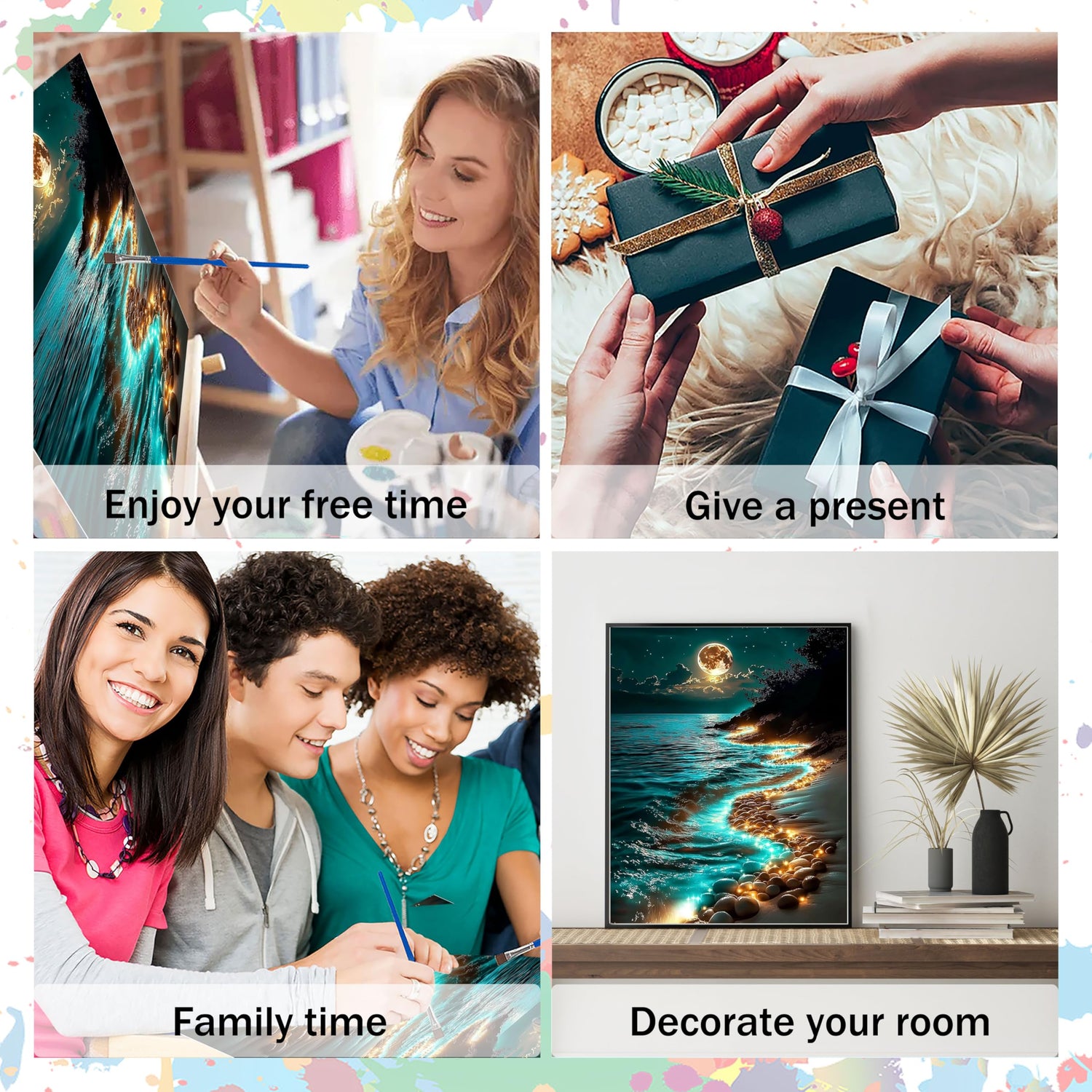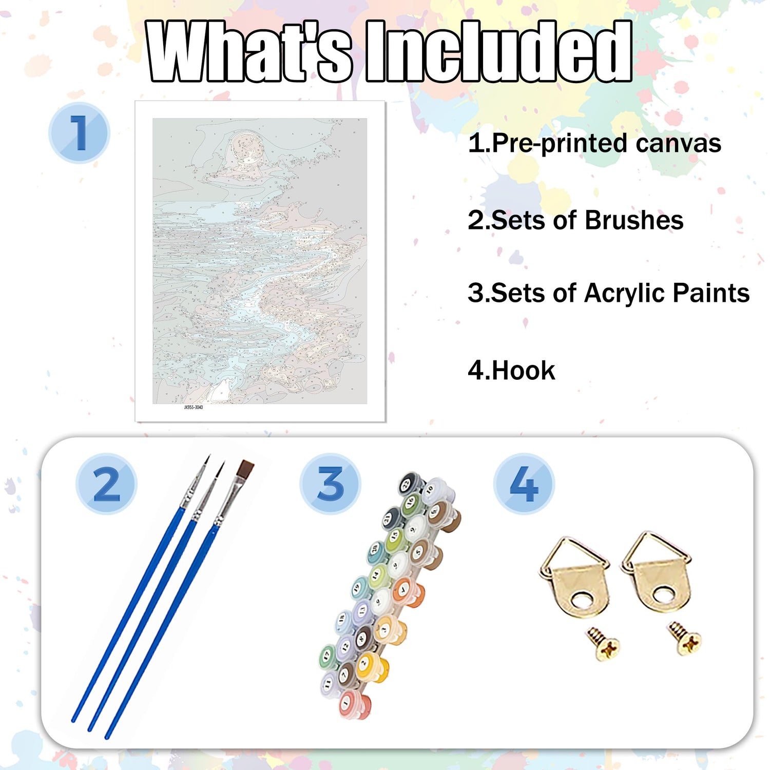 - 1.Moonlight canvas paint by numbers for adults:Acrylic DIY paint by number has a complete tool kit,including 3*nylon brushes,2*hook nails,1*matched Acrylic paint and 1*HD Canvas.Open the package and you can start painting immediately.