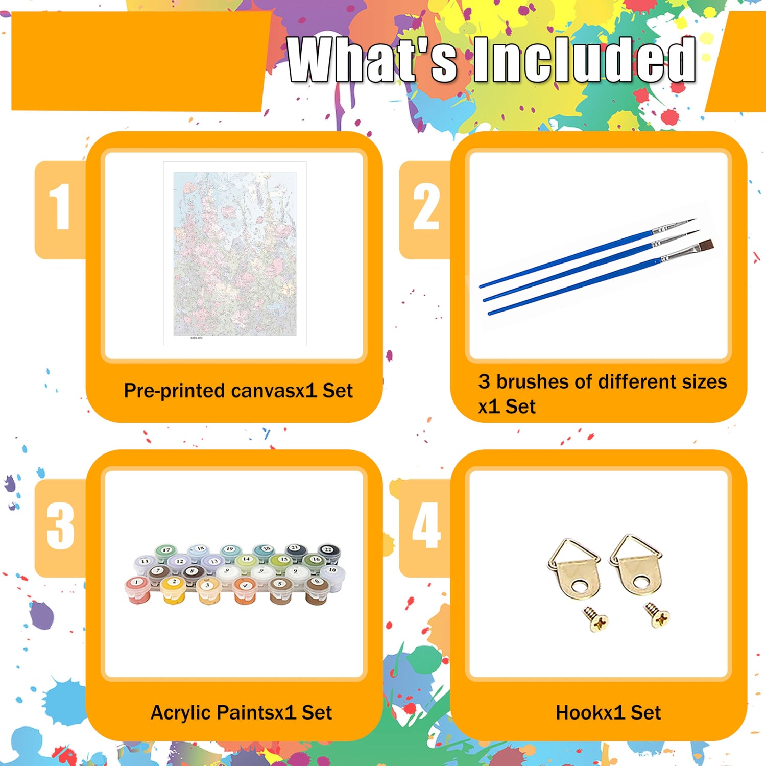 - 1.Flowers canvas paint by numbers for adults:Acrylic DIY paint by number has a complete tool kit,including 3*nylon brushes,2*hook nails,1*matched Acrylic paint and 1*HD Canvas.Open the package and you can start painting immediately.