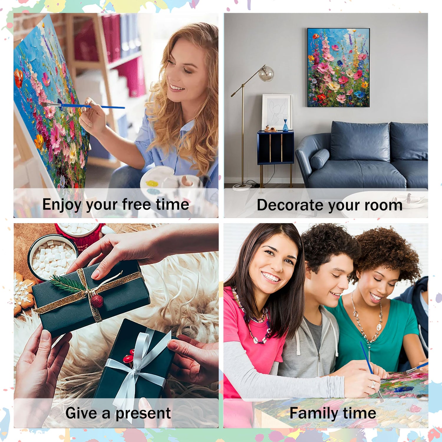 - 2.Flowers paint by numbers:Paint by numbers develops patience,improves concentration,promotes hand-eye coordination,fine motor skills and creativity.