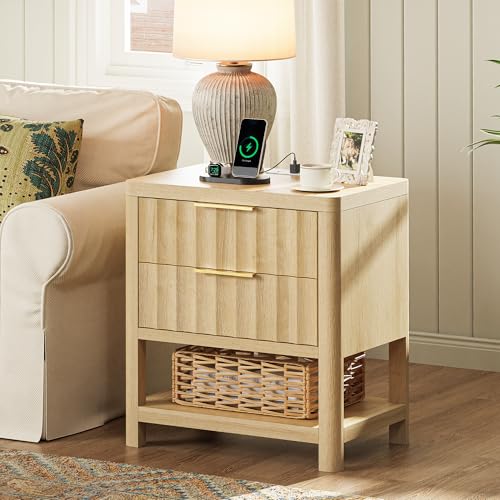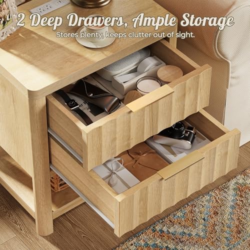 Huuger 27.6 Inch Tall Night Stands with Charger Station, USB-C Port, Fluted Nightstand Set of 2, Larger Wider Bed Side Table with 2 Deep Drawers, Open Shelf, Bedroom Living Room End Table, Natural