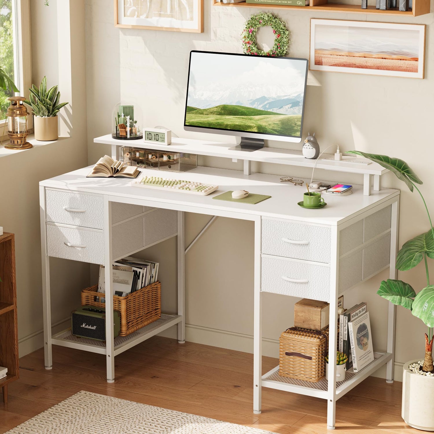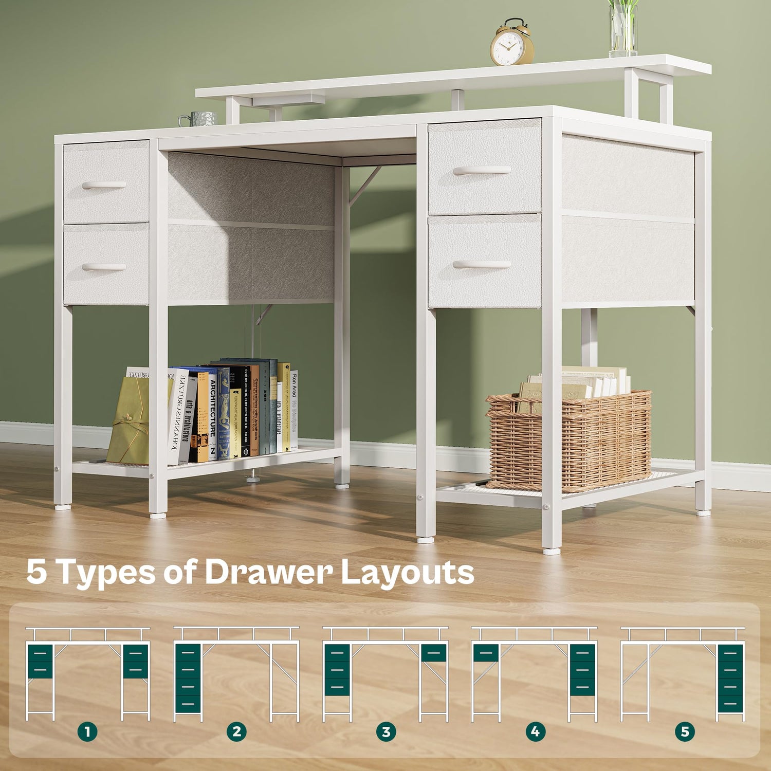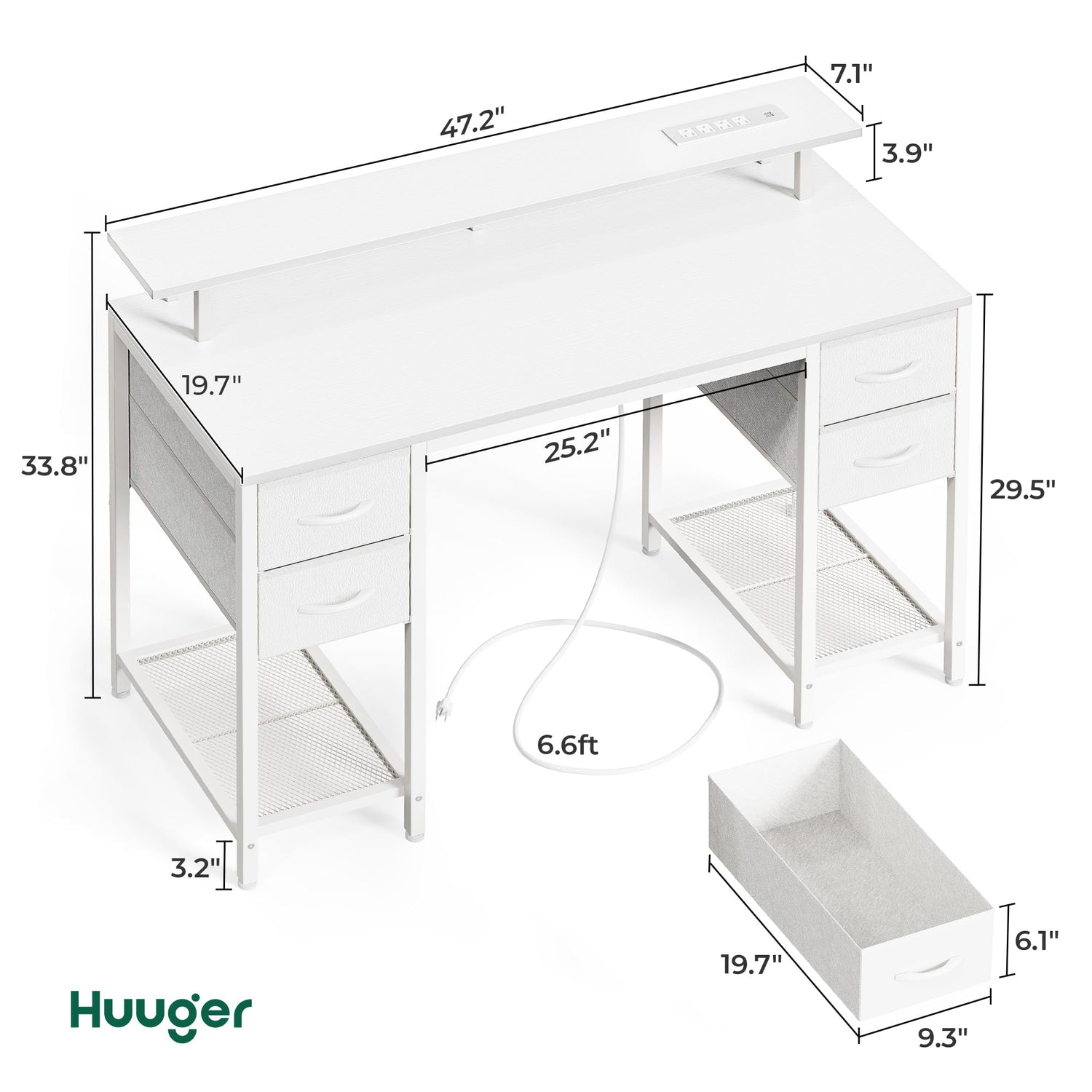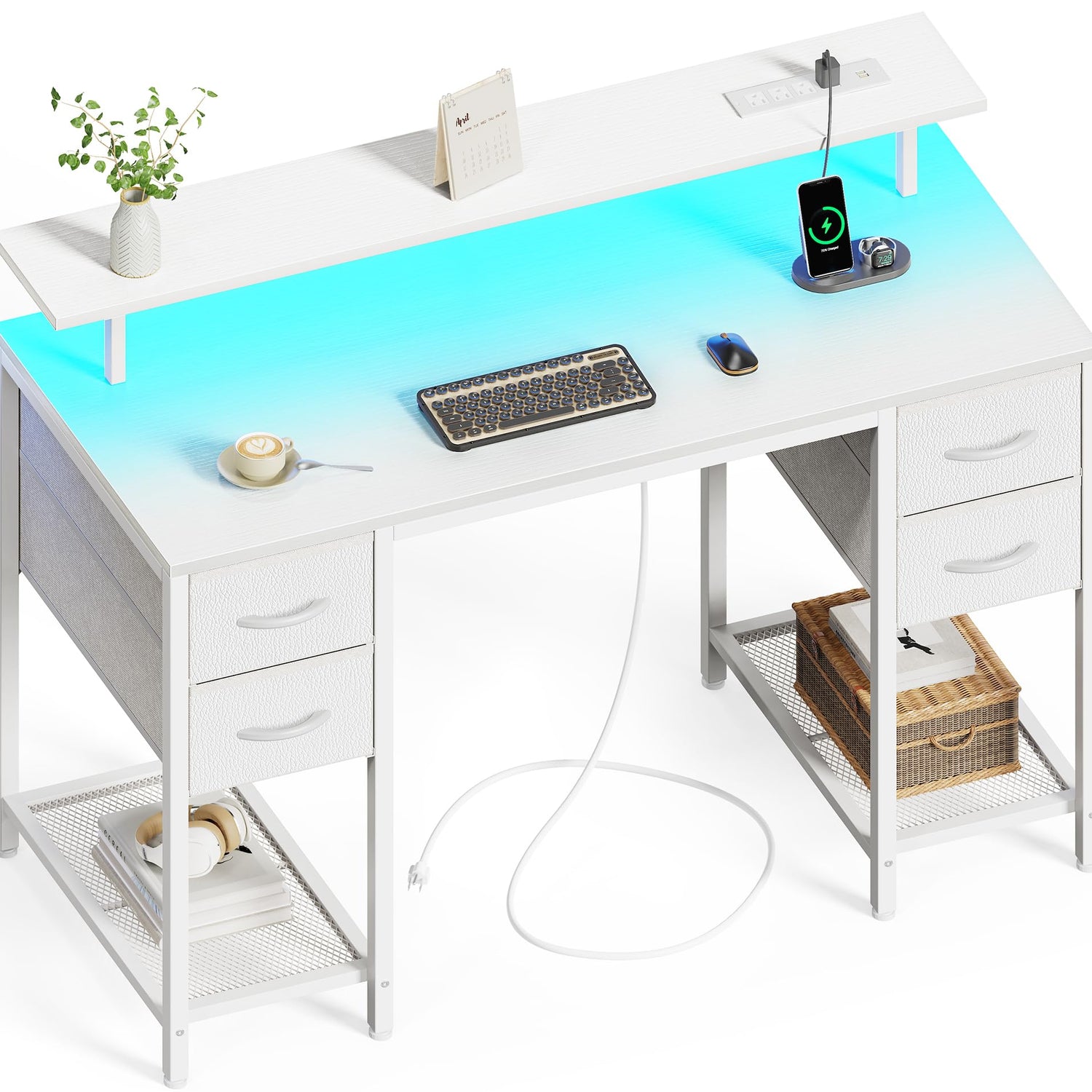 Huuger 47 inch Computer Desk with 4 Drawers, Gaming Desk with LED Lights & Power Outlets, Home Office Desk with Large Storage Space for Bedroom, Work from Home, White