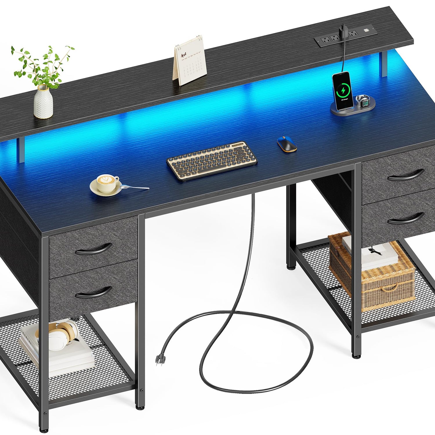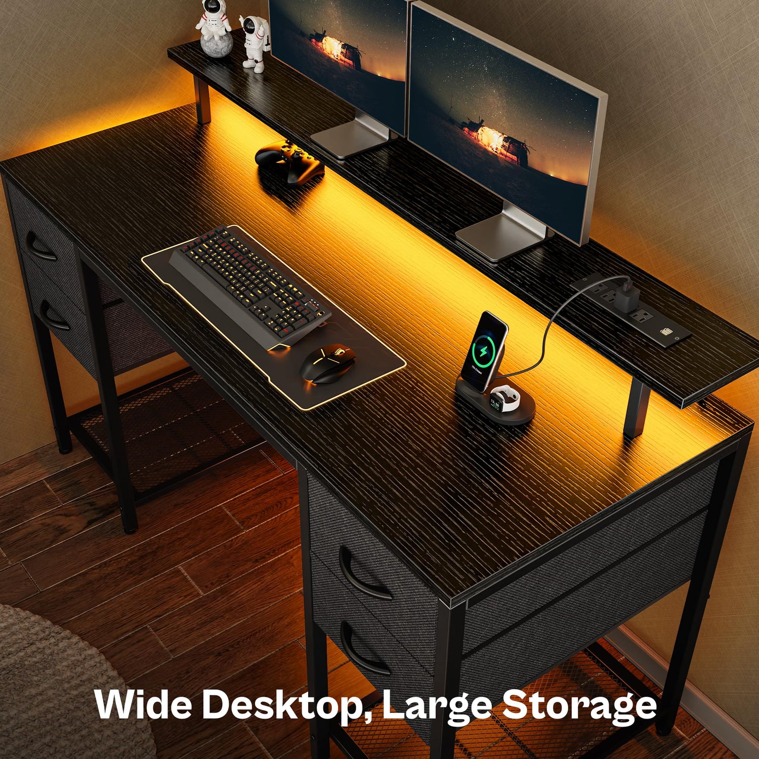Huuger 55 inch Computer Desk with 4 Drawers, Gaming Desk with LED Lights & Power Outlets, Home Office Desk with Large Storage Space for Bedroom, Work from Home, Black