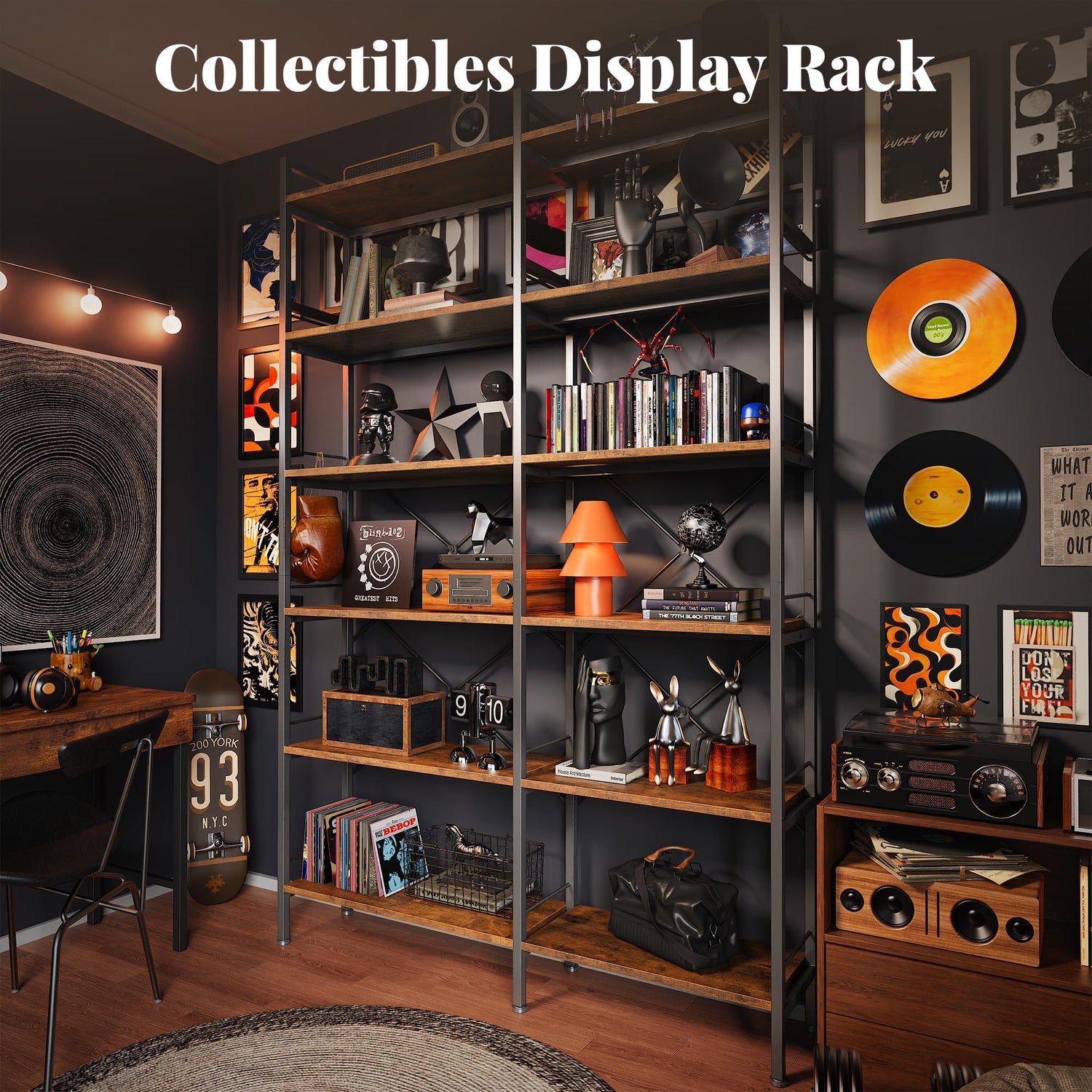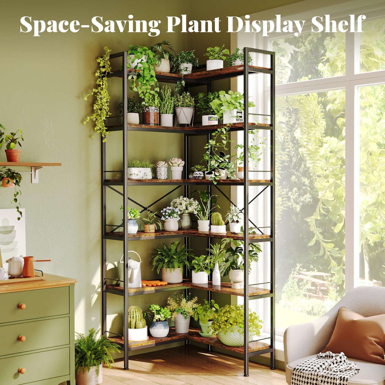 Huuger 6 Tier Bookshelf, L Shaped Corner Bookshelf with Open Shelves, 49.4 Inch Straight Wide Bookcase with Metal Frame and Wooden Board, Adjustable Feet, Rustic Brown
