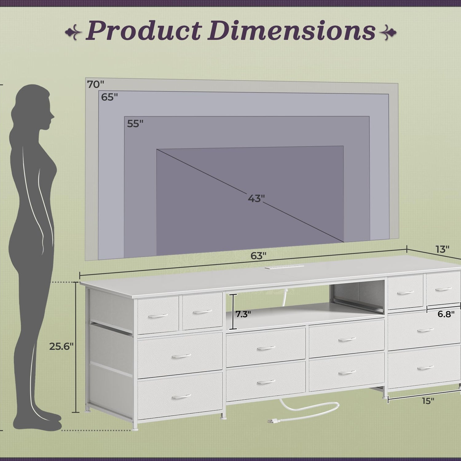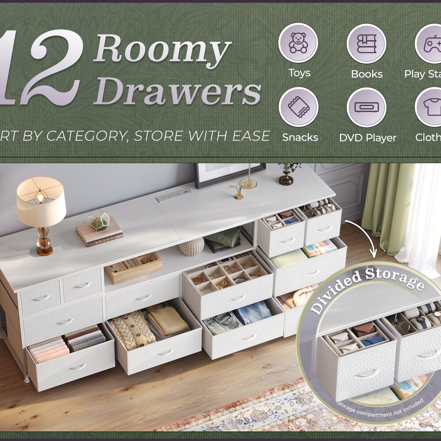 - 【12 Drawer Long TV Stand in 3 Sizes】With 12 drawers in 3 thoughtful sizes, this long dresser for bedroom has room for socks, sweaters, Xbox controllers, throw blankets, toys, you name it. The top drawers are great for the small stuff, and the deeper ones handle the rest