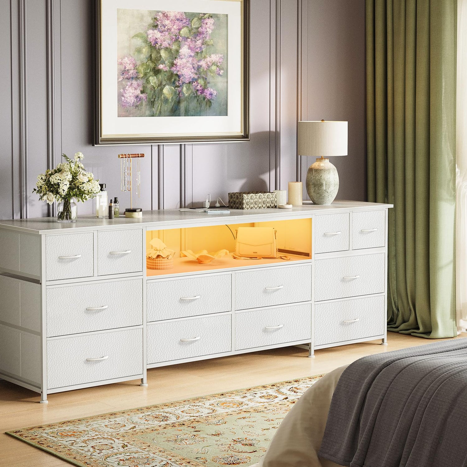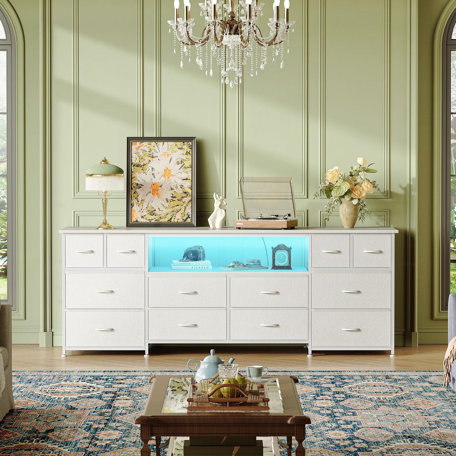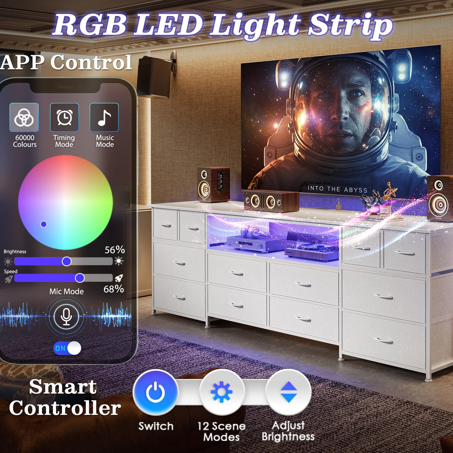 Huuger 63 Inch Dresser TV Stand with LED Lights, Power Outlets and USB-C Port, 12 Fabric Drawer Dresser for Bedroom, Wide Entertainment Center for 65, 70 Inch TV, Media Console, Open Shelf, White