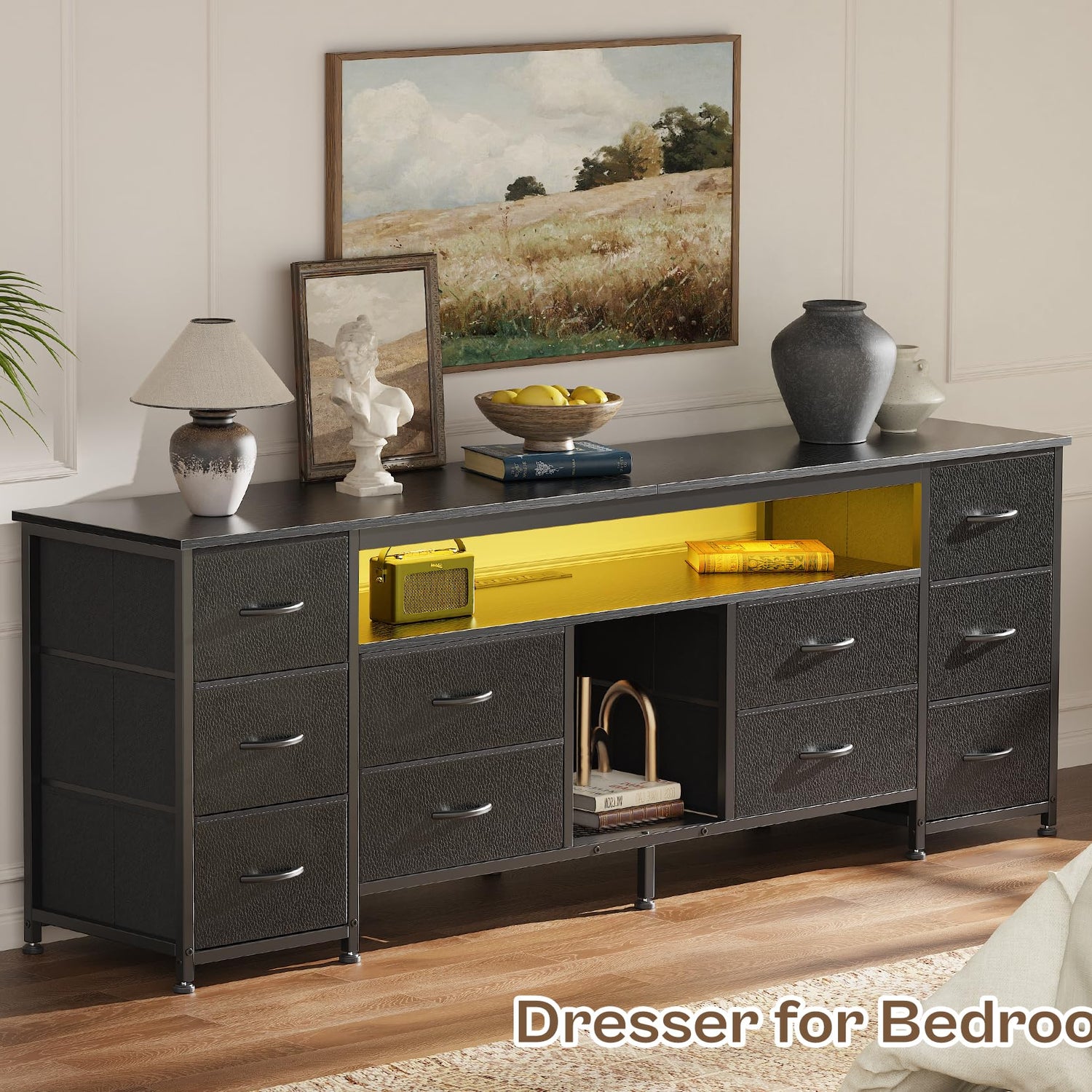 - 【10 Drawer Dresser with Storage】Featuring 10 drawers in 2 sizes, this led dresser for bedroom has a stunning storage, allowing you to neatly organize and store your media devices, DVDs, gaming consoles, books, other accessories. The drawers are great for additional, out of sight storage. You can also store your items on the shelves in the middle