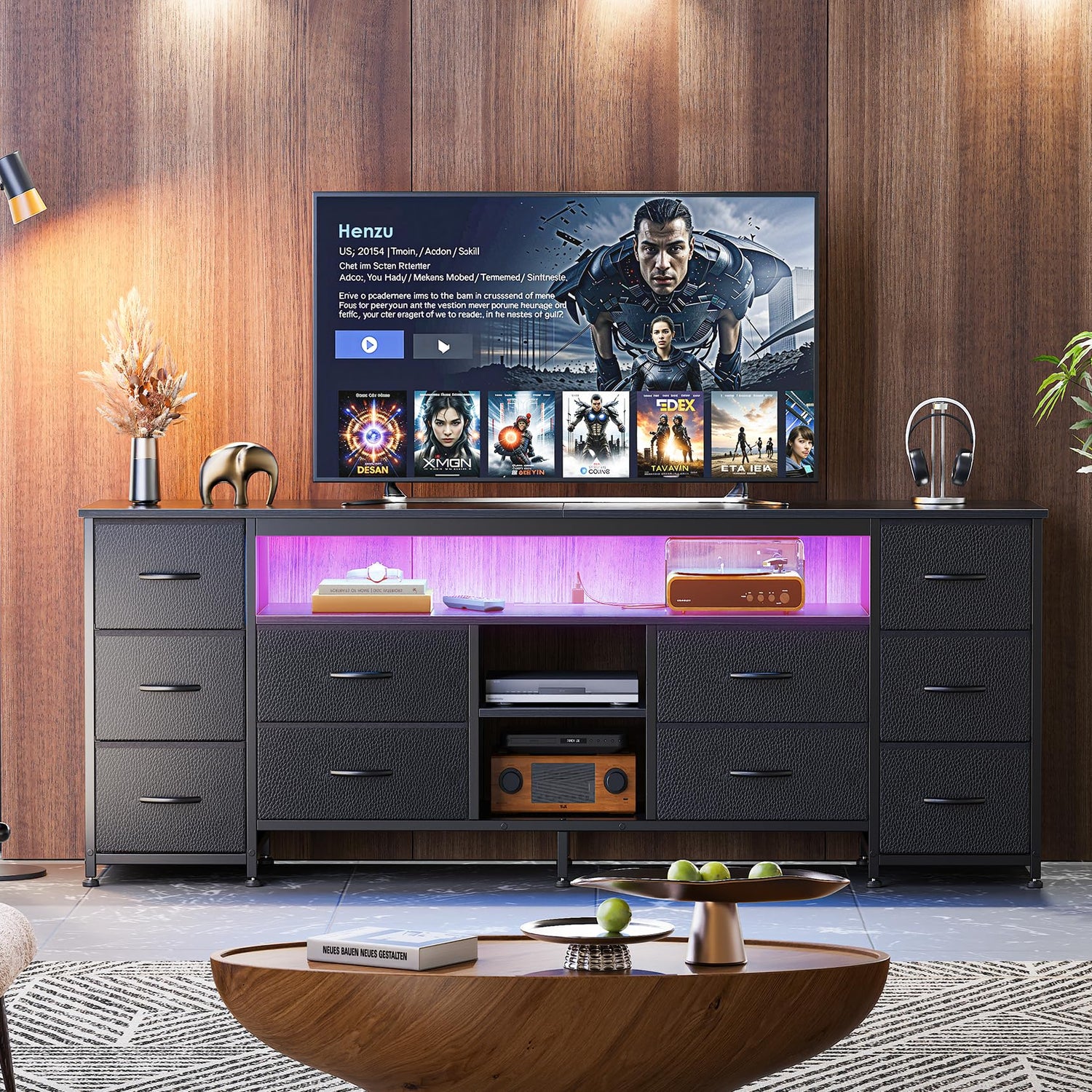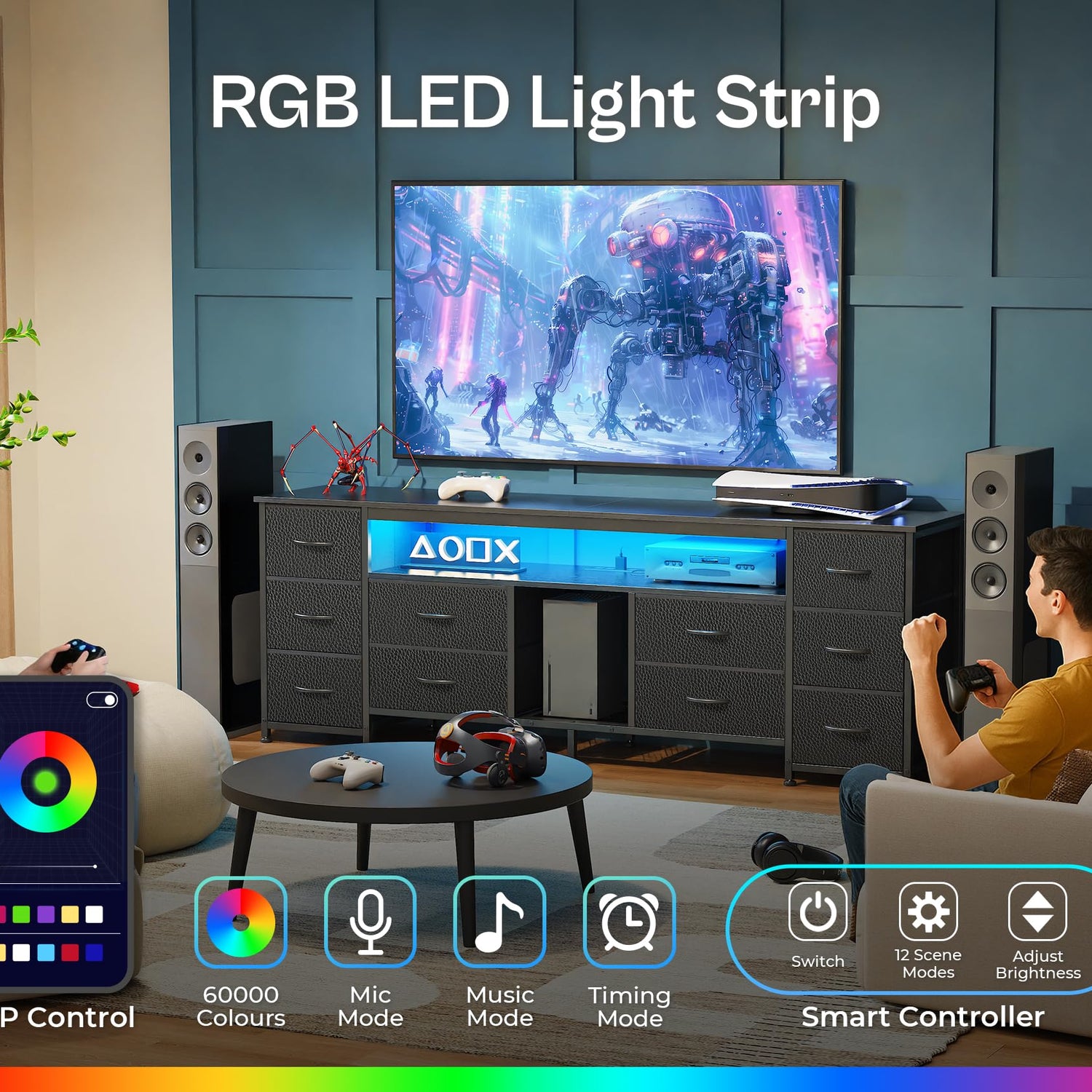 - 【LED TV Stand with Power Outlets】With 4 AC outlets, 2 USB ports, and a USB-C port, your TV, soundbar, and gaming gear are always charged and ready. Want to set the mood? The built-in LED lights on the bedroom dresser bring your room to life, choose from over 60,000 colors, sync with your music, or schedule lighting scenes via app. Perfect for gamers who want immersive RGB lighting