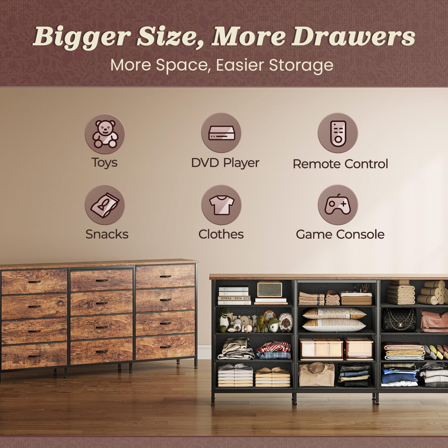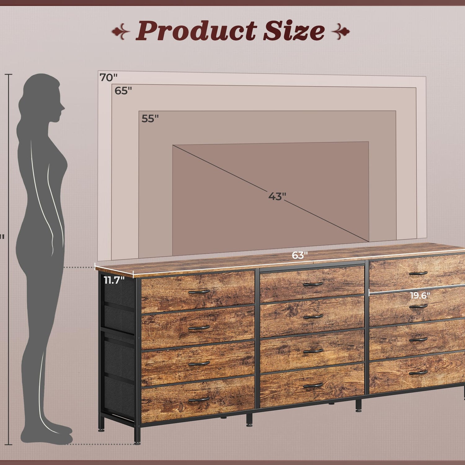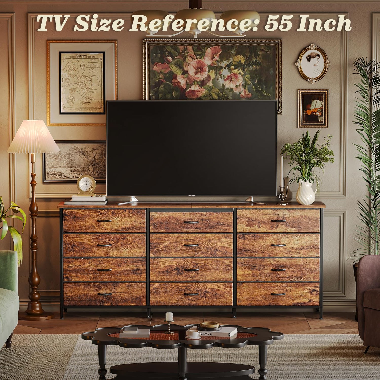 Huuger 63 Inch Long Dresser for Bedroom, TV Stand for 65, 70 Inch TV, 12 Drawer Dresser for Closet, Chest of Drawers, Large Fabric Drawers for Bedroom, Media Console, Rustic Brown