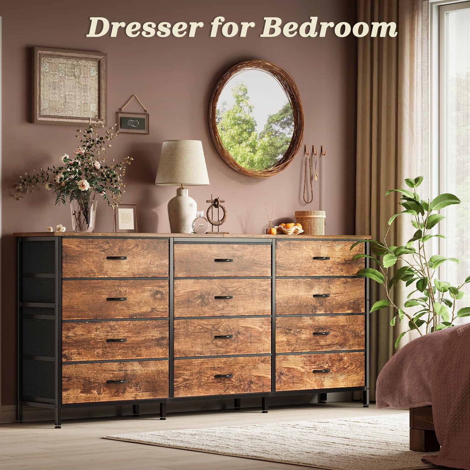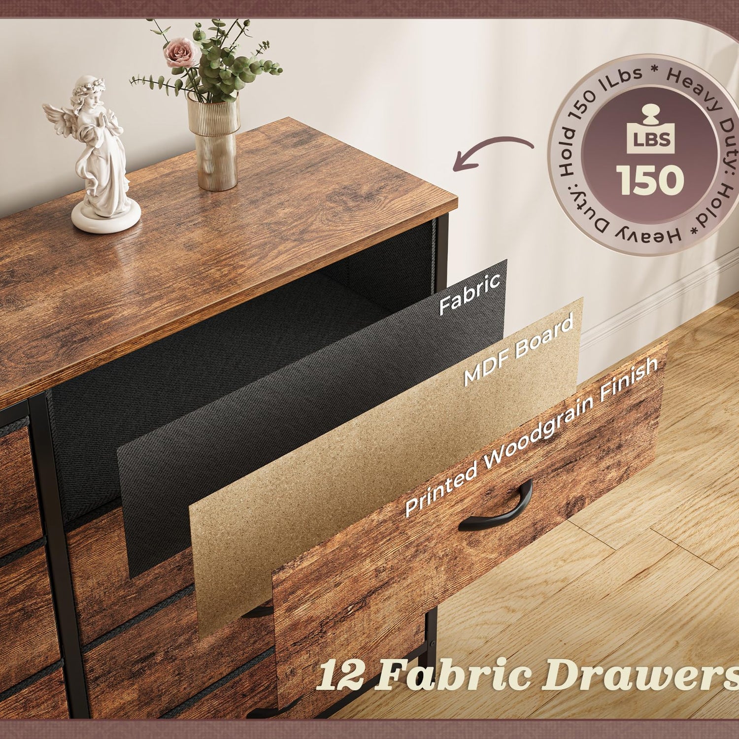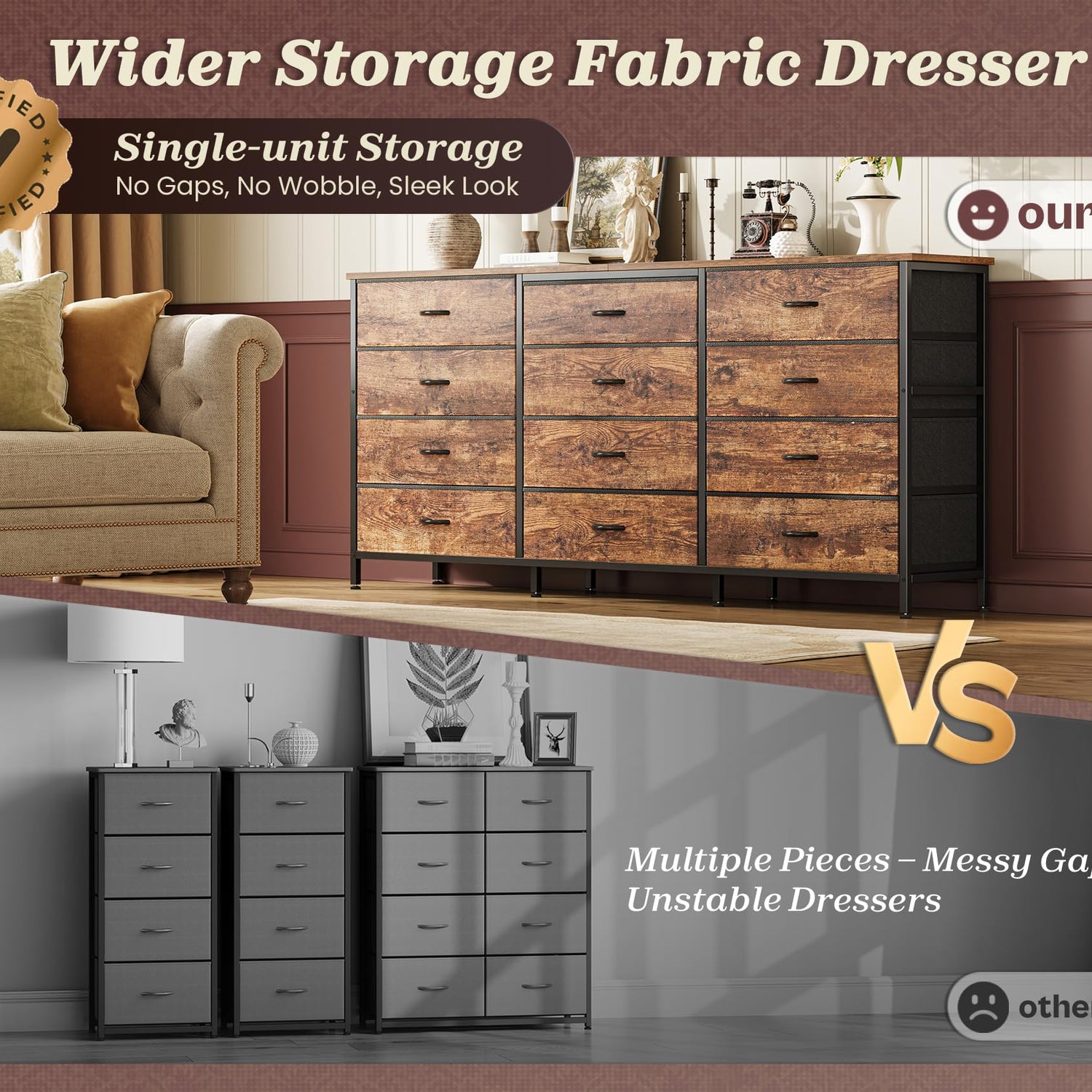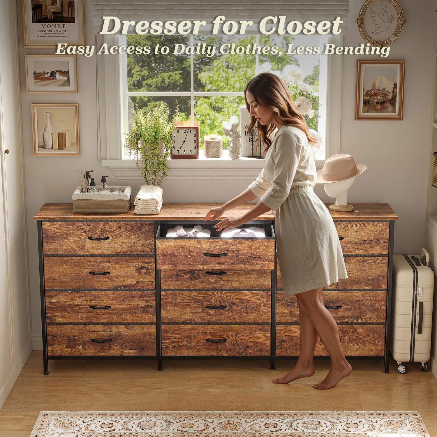 Huuger 63 Inch Long Dresser for Bedroom, TV Stand for 65, 70 Inch TV, 12 Drawer Dresser for Closet, Chest of Drawers, Large Fabric Drawers for Bedroom, Media Console, Rustic Brown