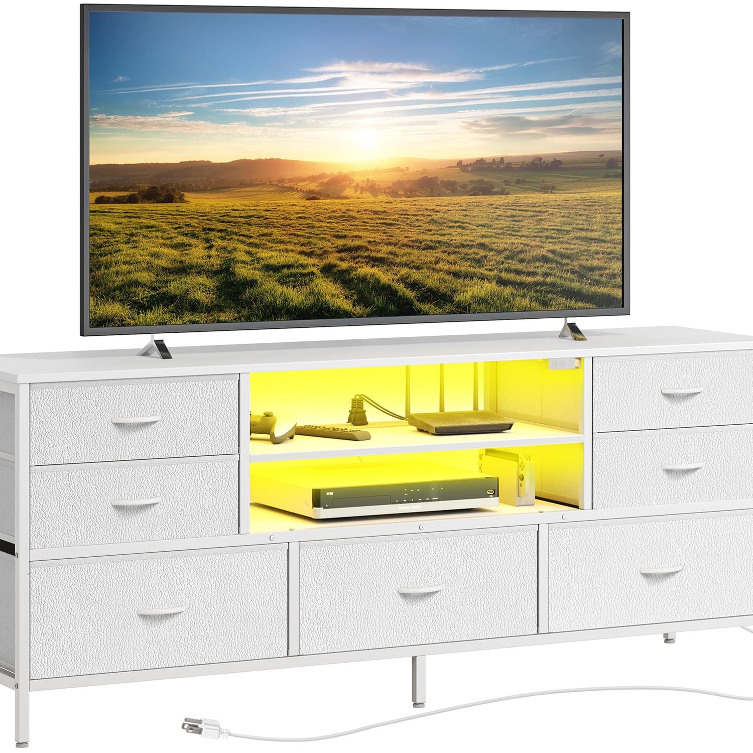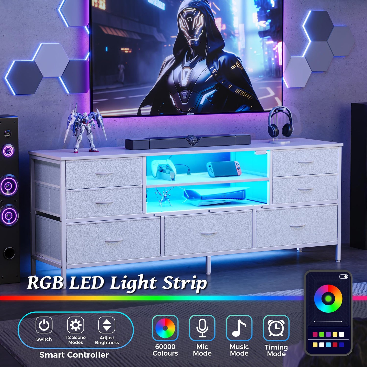 Huuger Dresser for Bedroom With Power Outlets and LED Lights, 7 Drawers TV Stand for 60 Inch TV, Console With Open Shelf, 55 Inches Wide White, PU Leather