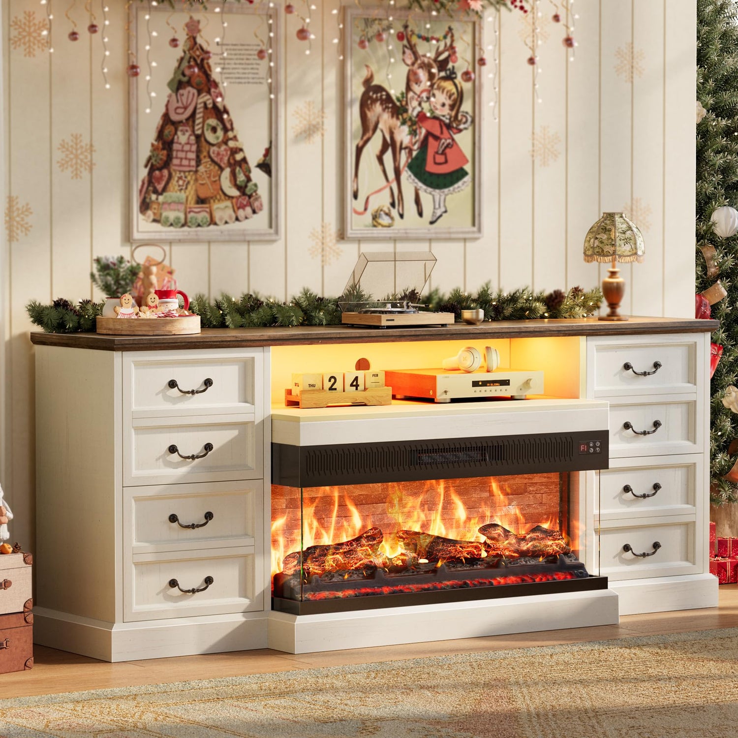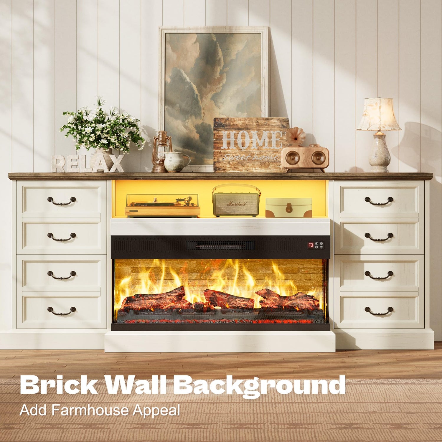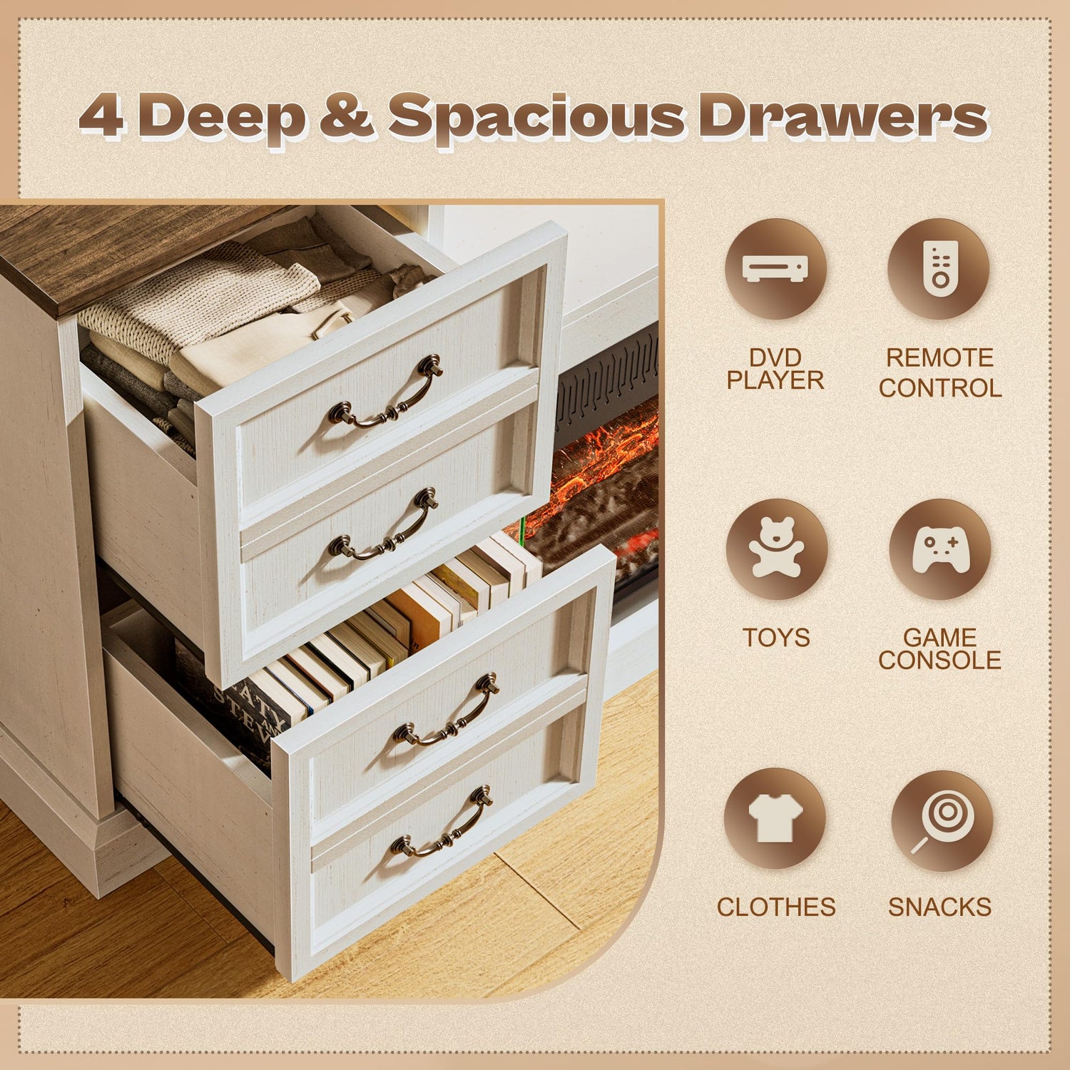- 【4 Deep Drawers】Equipped with 4 large storage drawers and open shelves with wire cutouts, this tv fireplace stand easily organizes everything from game consoles to speakers. With double drawer exterior surface design and retro metal handles, this farmhouse tv stand with fireplace shows great elegance and farmhouse style