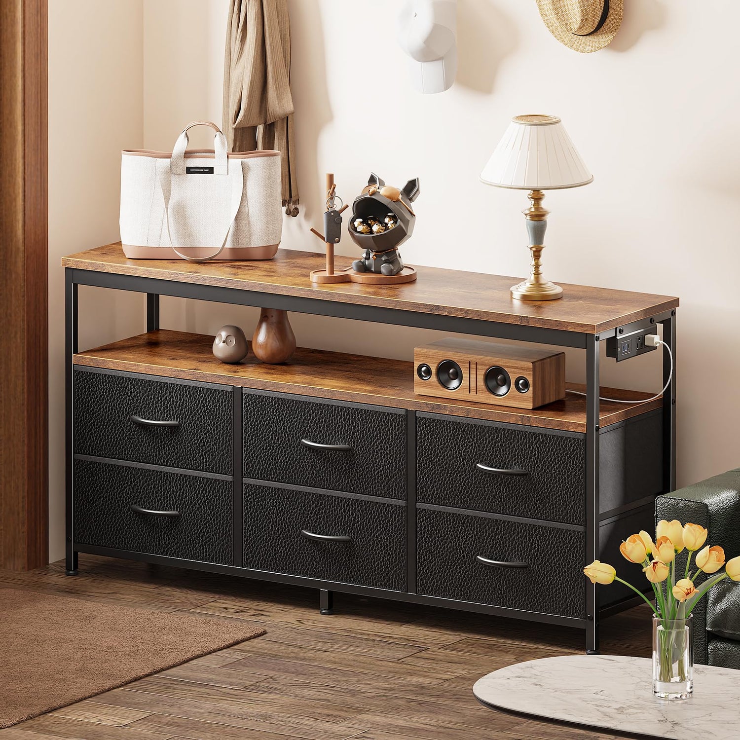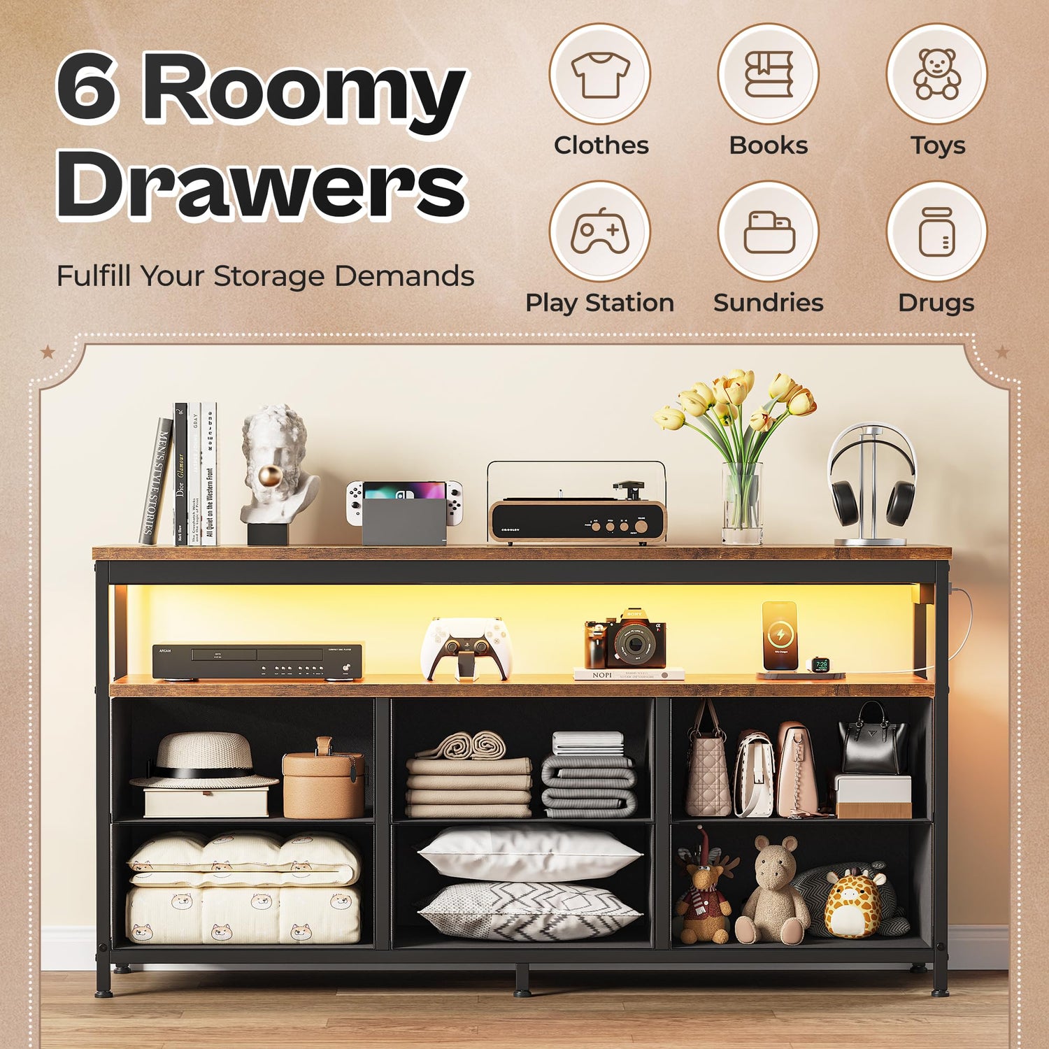 - 【Spacious 6-Drawer Storage & Support TV up to 55 Inches】With 6 large drawers, this 6 drawer dresser for bedroom is perfect for storing essentials, from clothes and blankets to books and electronics. The open shelf is ideal for showcasing photos, plants, or decorative items, and and spacious desktop can securely support a TV up to 55 inches, creating a tidy, multifunctional space in your home