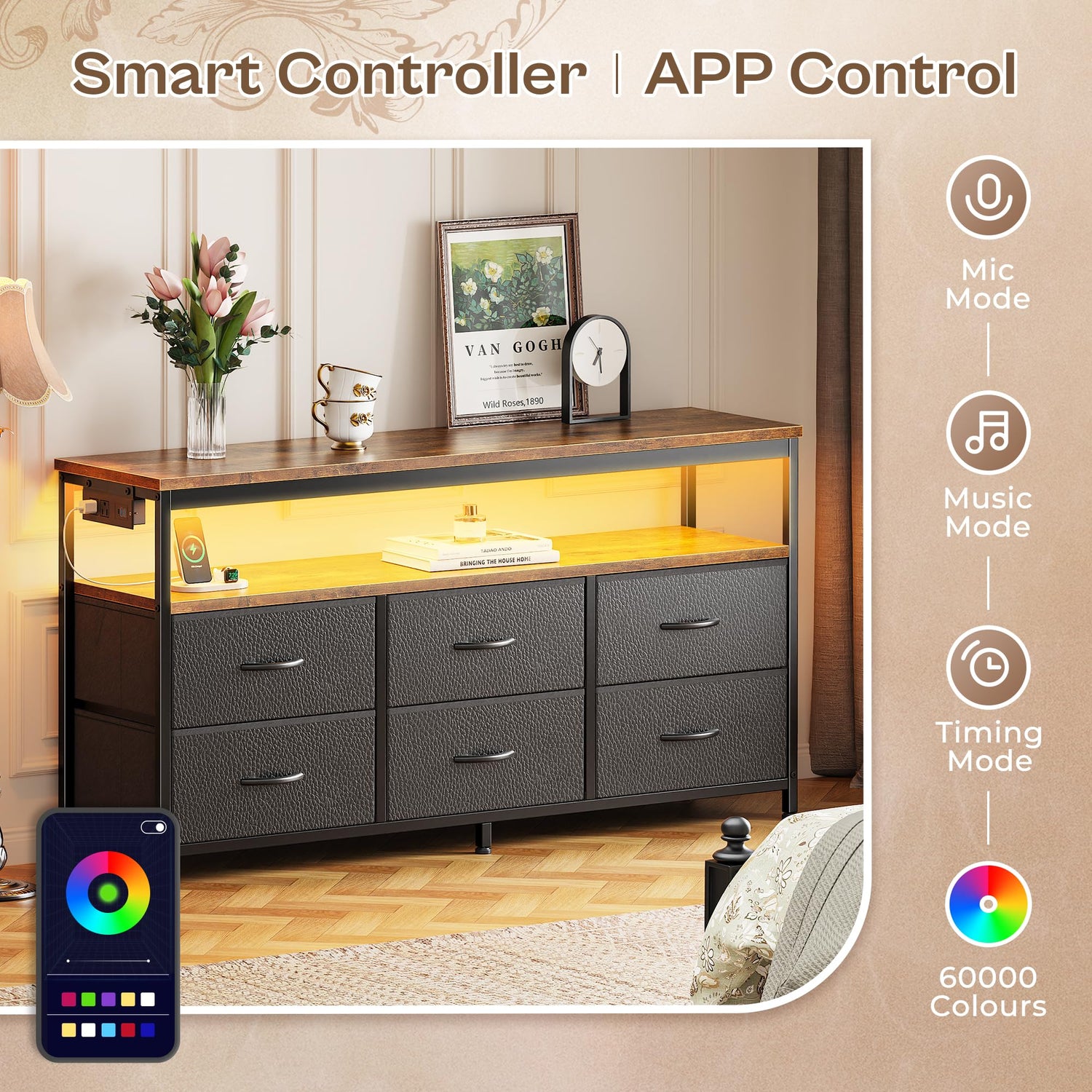 - 【LED TV Stand Dresser】2 ways to control lights - smart controller or app. Choose from over 6,000 colors or adjust the glow to your mood. Set a calming nightlight with the timer for a cozy evening, or try mic mode for interactive color displays during gatherings. Elevate your movie nights or game sessions with a vibrant, personalized light backdrop