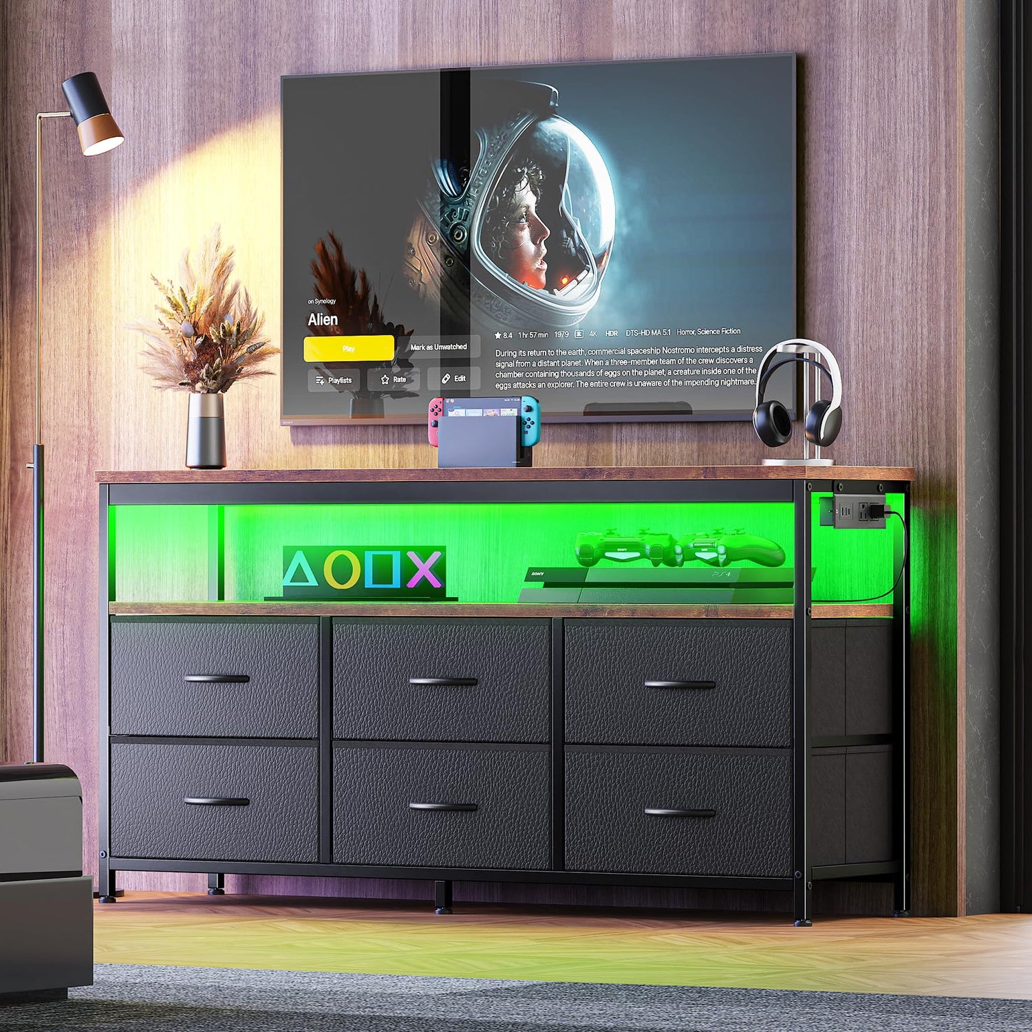 Huuger LED TV Stand for Bedroom, 47 Inch Dresser with Power Outlets, Entertainment Center for 55, 50, 43 Inch TV, 6 Drawer Dresser for Bedroom, Chest of Drawers with Shlef, PU Leather, Rustic Brown