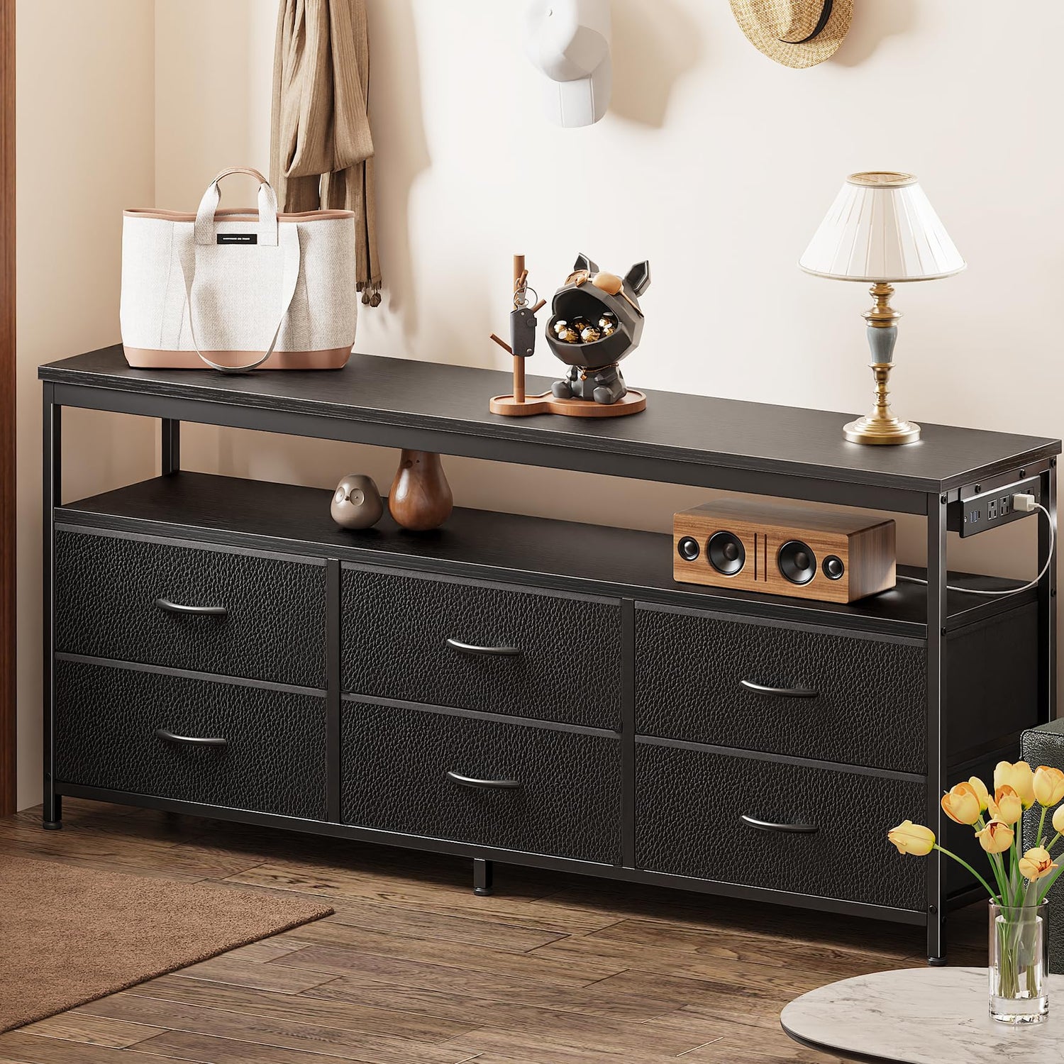 - 【Stable and Safe Design】Crafted with a robust metal frame and thick wood top, this storage dresser provides steady support for your belongings and TV. Equipped with anti-tip safety kits and five adjustable feet, it stays stable on uneven floors, keeping both your family and flooring safe from accidental tipping or scratches