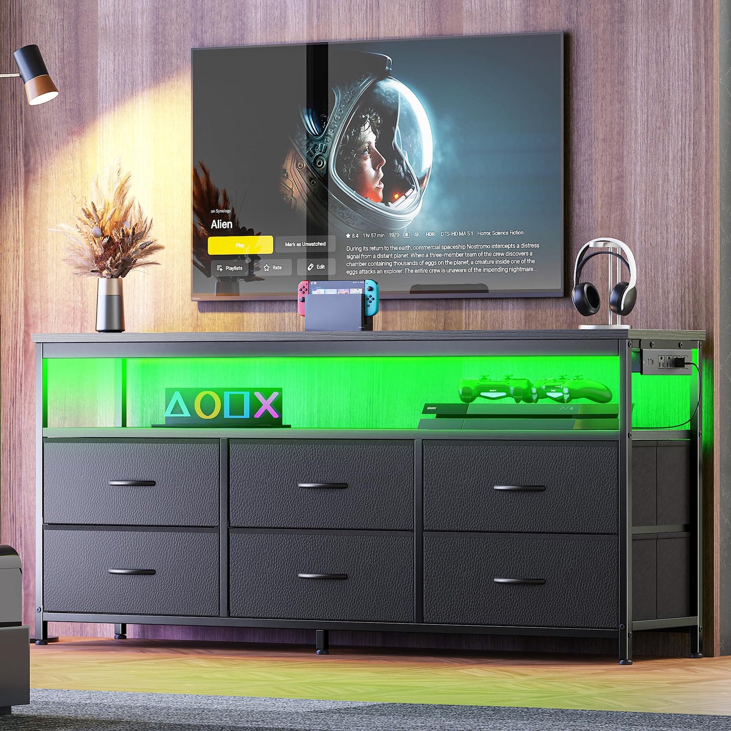 - 【LED TV Stand Dresser】2 ways to control lights - smart controller or app. Choose from over 6,000 colors or adjust the glow to your mood. Set a calming nightlight with the timer for a cozy evening, or try mic mode for interactive color displays during gatherings. Elevate your movie nights or game sessions with a vibrant, personalized light backdrop