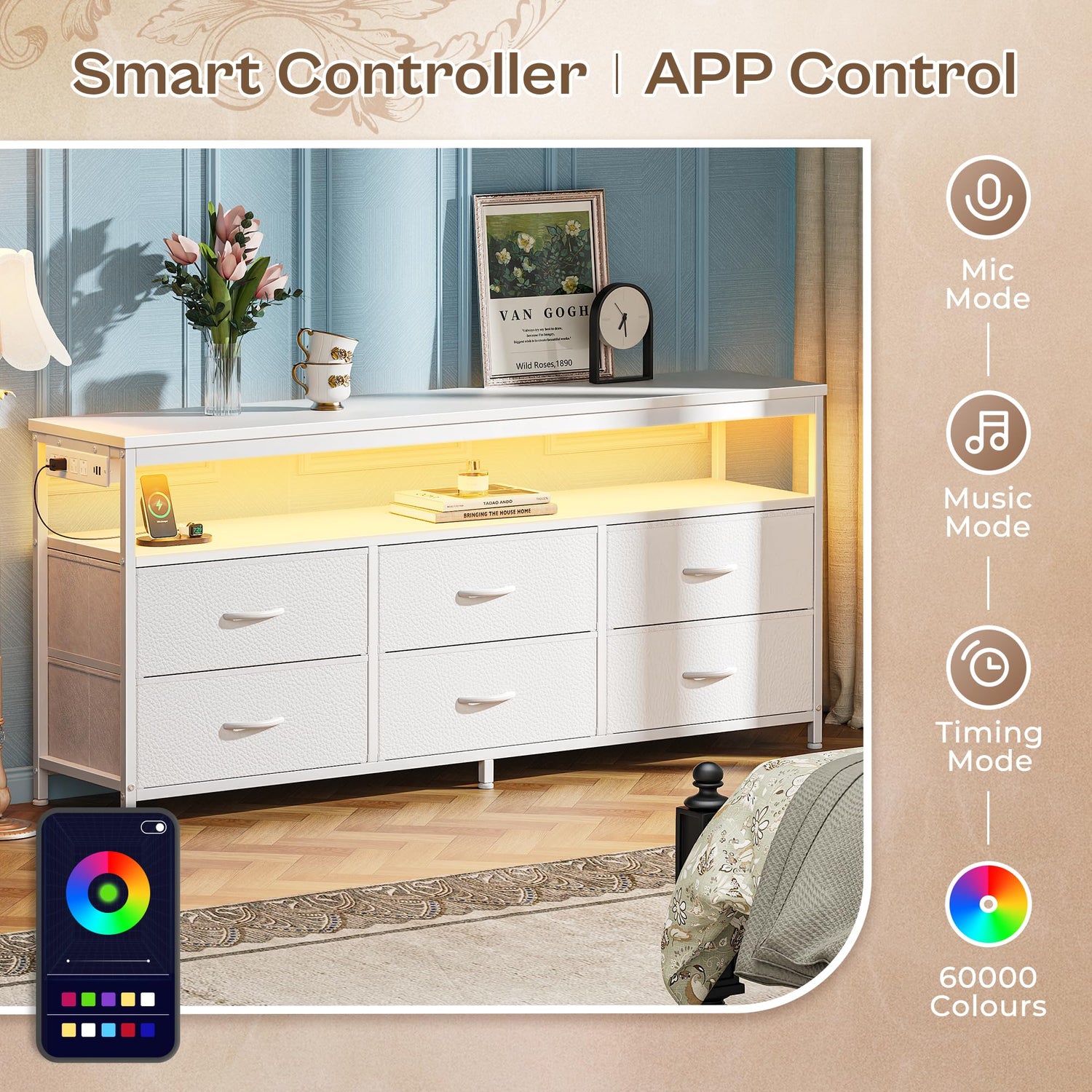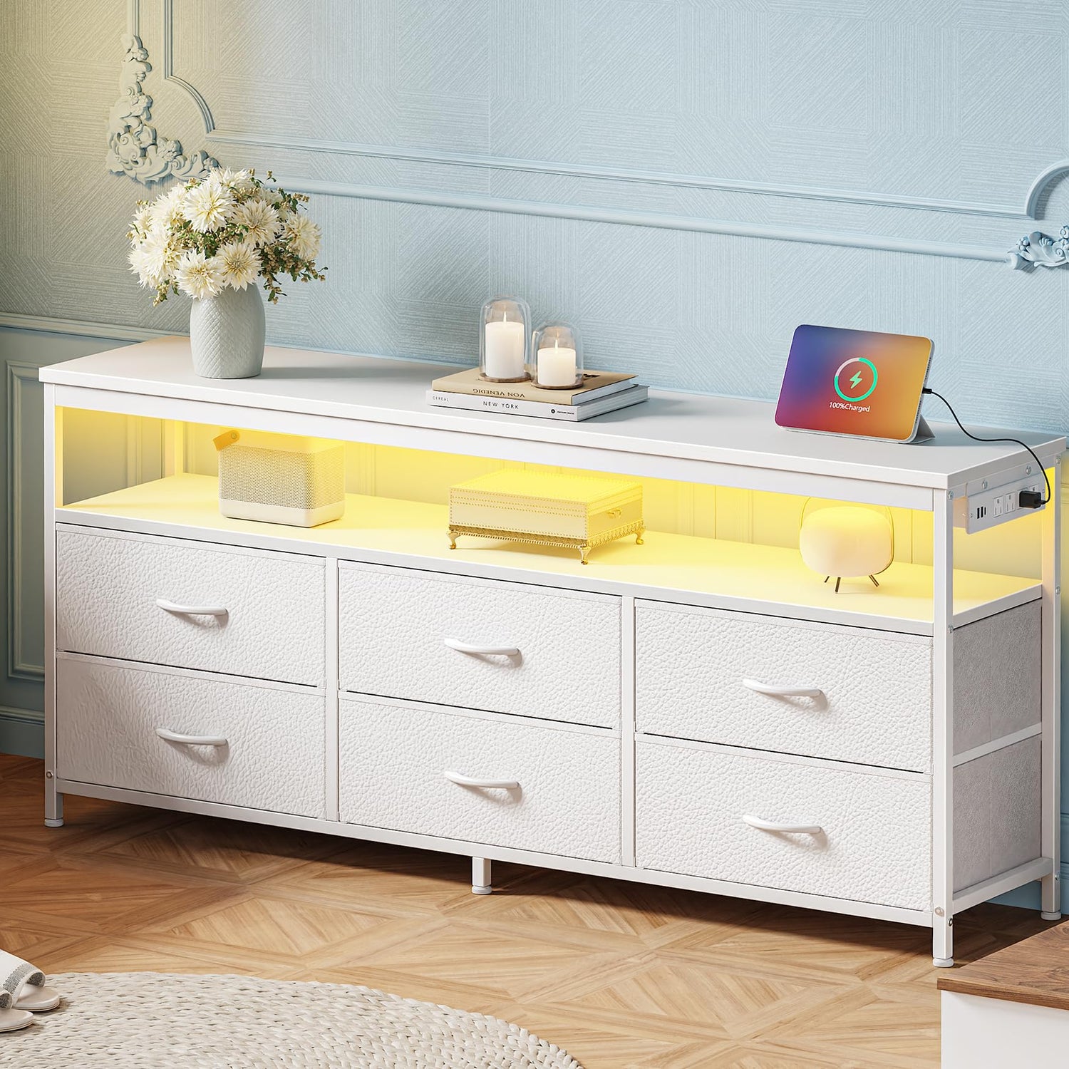 Huuger LED TV Stand for Bedroom, 55 Inch Fabric Dresser with Power Outlets, Entertainment Center for 60, 55, 50 Inch TV, 6 Drawer Dresser for Bedroom, Chest of Drawers with Shlef, PU Leather, White