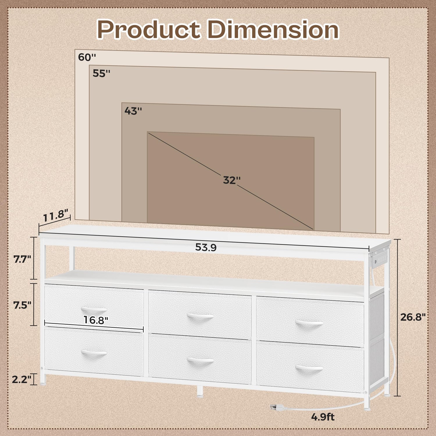 - 【Spacious 6-Drawer Storage & Support TV up to 60 Inches】With 6 large fabric drawers, this 6 drawer dresser for bedroom is perfect for storing essentials, from clothes and blankets to books and electronics. The open shelf is ideal for showcasing photos, plants, or decorative items, and and spacious desktop can securely support a TV up to 60 inches, creating a tidy, multifunctional space in your home