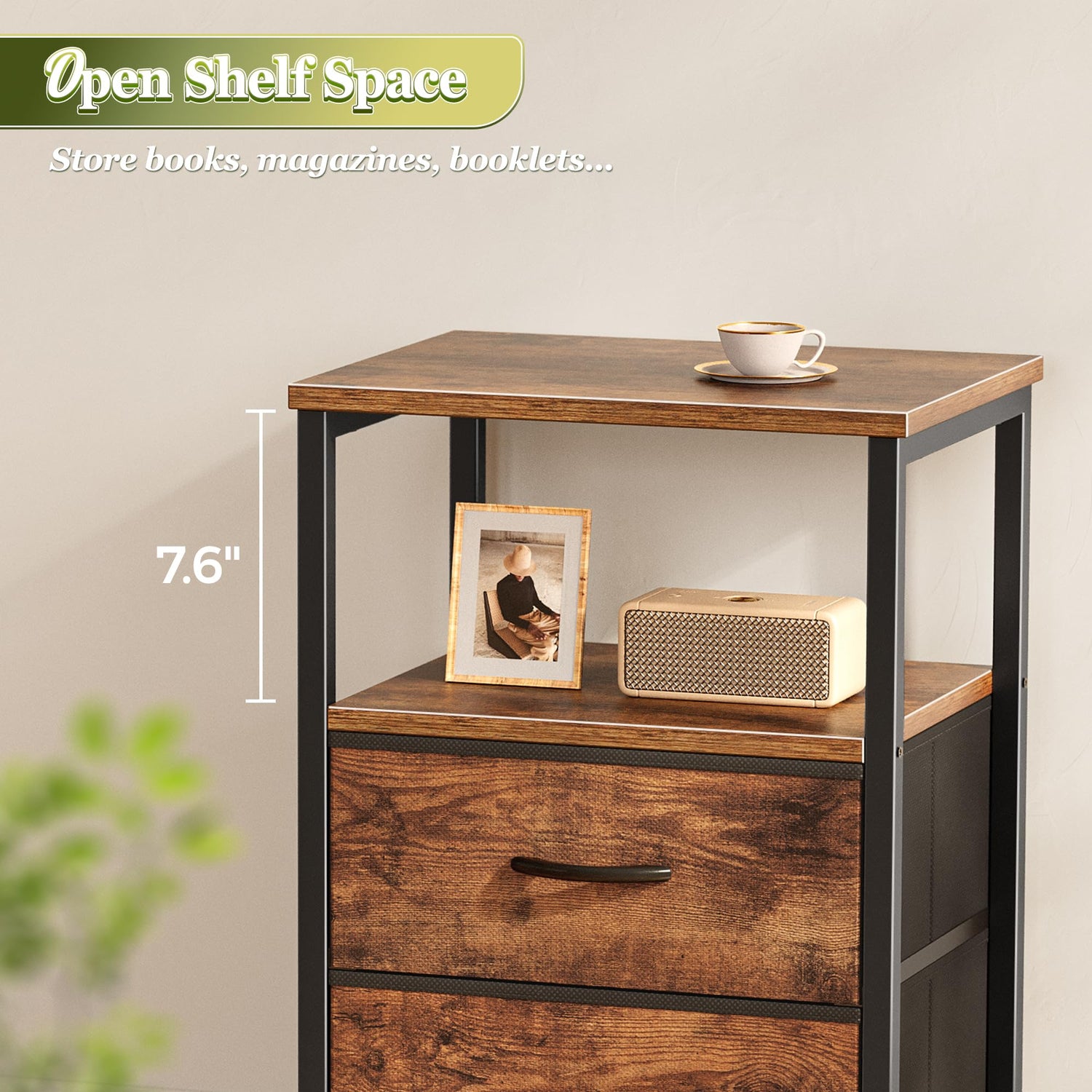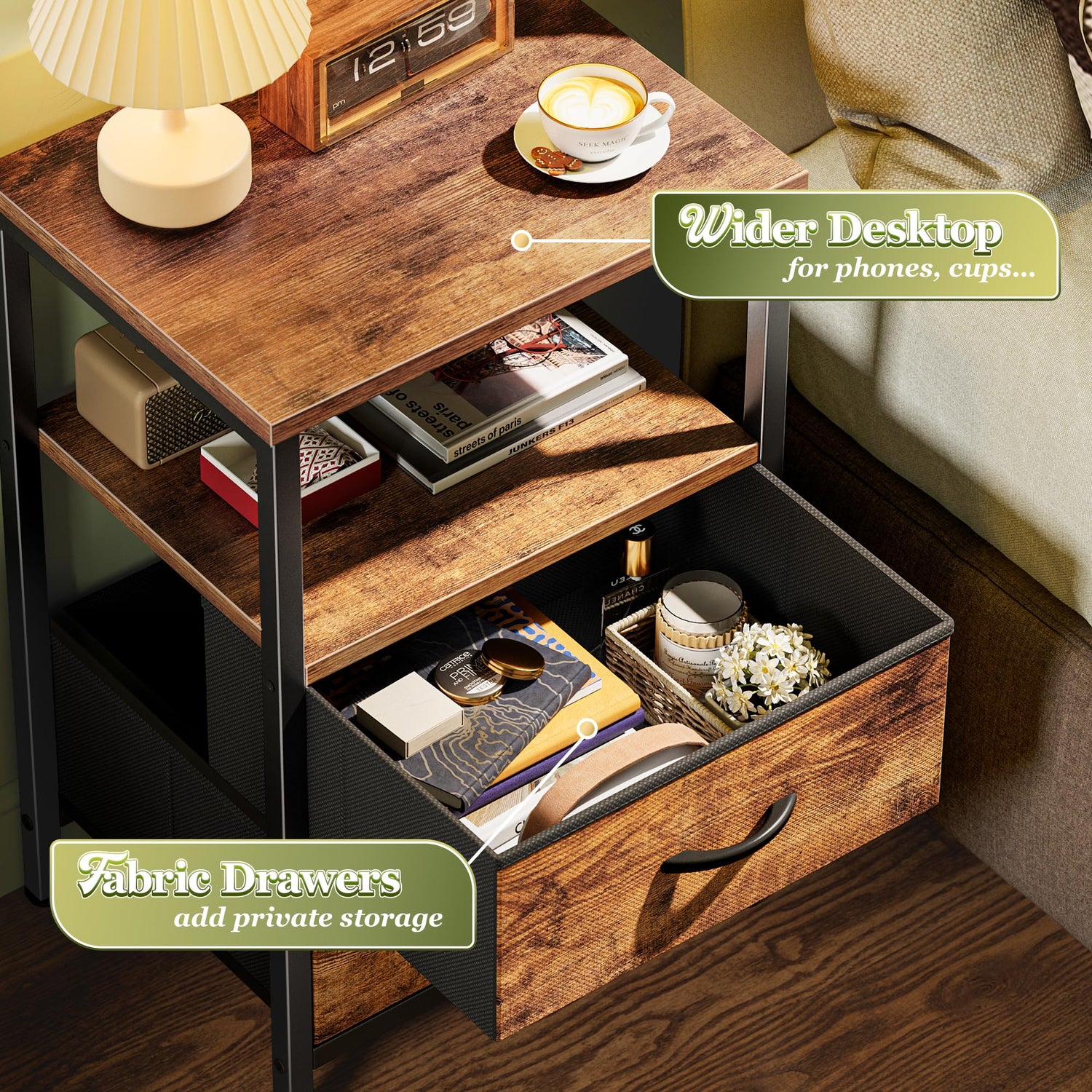 - 【Nightstand with 2 Drawers】2 spacious fabric drawers and an open shelf help you organize nighttime essentials, books, glasses, remotes, and more, all within easy reach. Enjoy a cleaner, calmer space with this bedside table