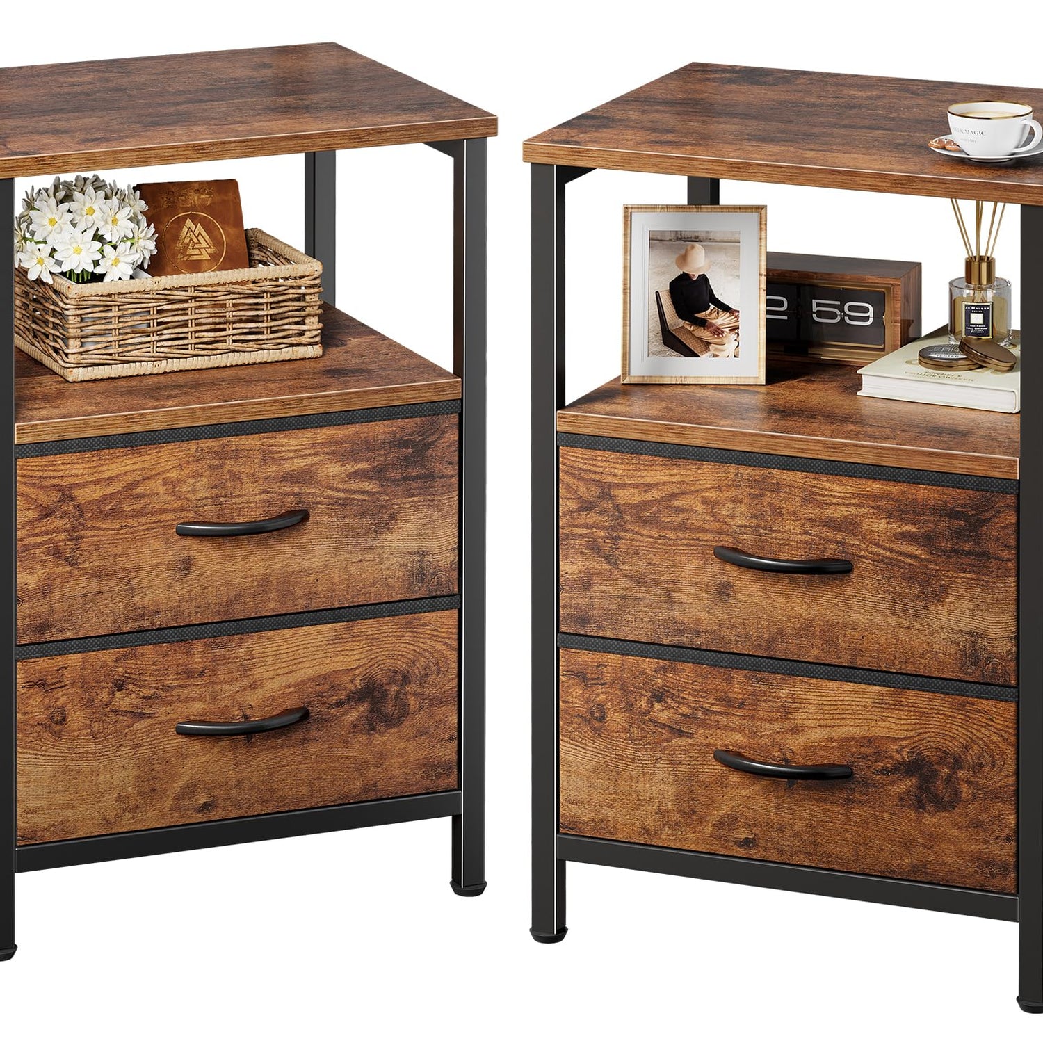 Huuger Night Stand Set of 2, Nightstand with 2 Drawers, Bed Side Table with Open Shelf, Wooden Top, End Table, Fabric Drawer, for Bedroom, Rustic Brown