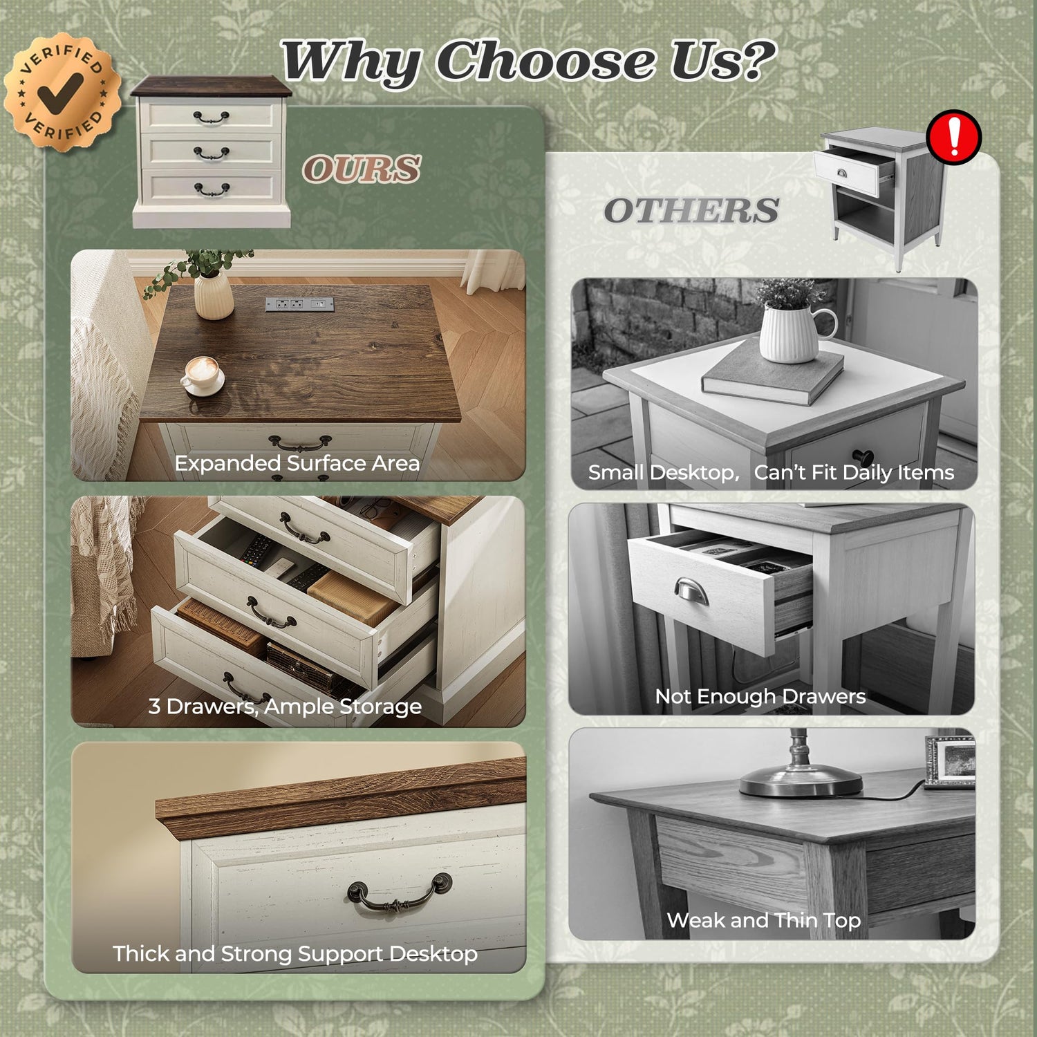 - 【Nightstand with 3 Drawers and Wide Desktop】Running out of space for your books, chargers, or bedtime essentials? This large nightstand has a thick 1.1-inch top that holds lamps or decor with ease, 3 spacious drawers for gadgets, plus an open compartment for grab-and-go items like magazines, books