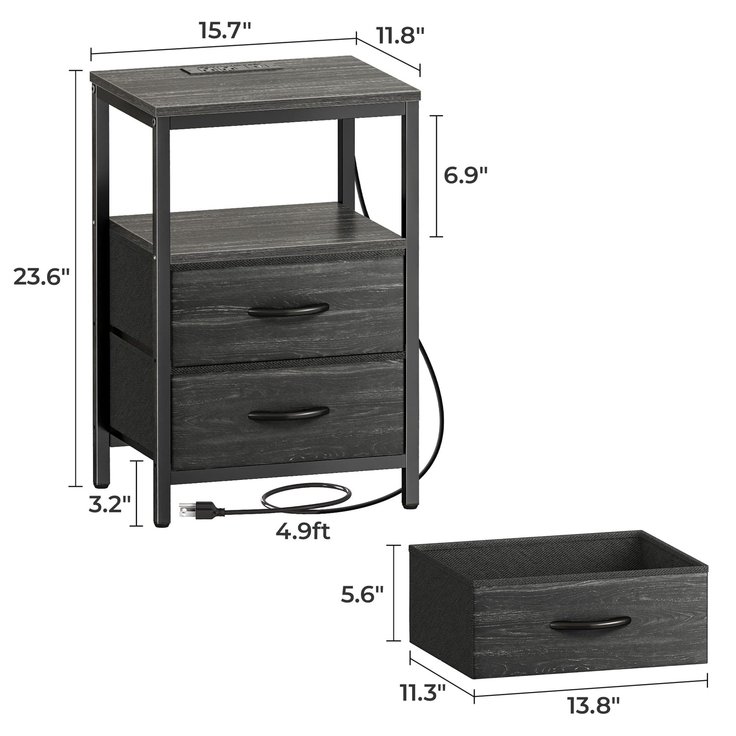 Huuger Nightstand with Charging Station, Side Table with Fabric Drawers, End Table with Open Shelf, Bedside Table with USB Ports and Outlets, Night Stand for Bedroom, Charcoal Black Wood Grain Print