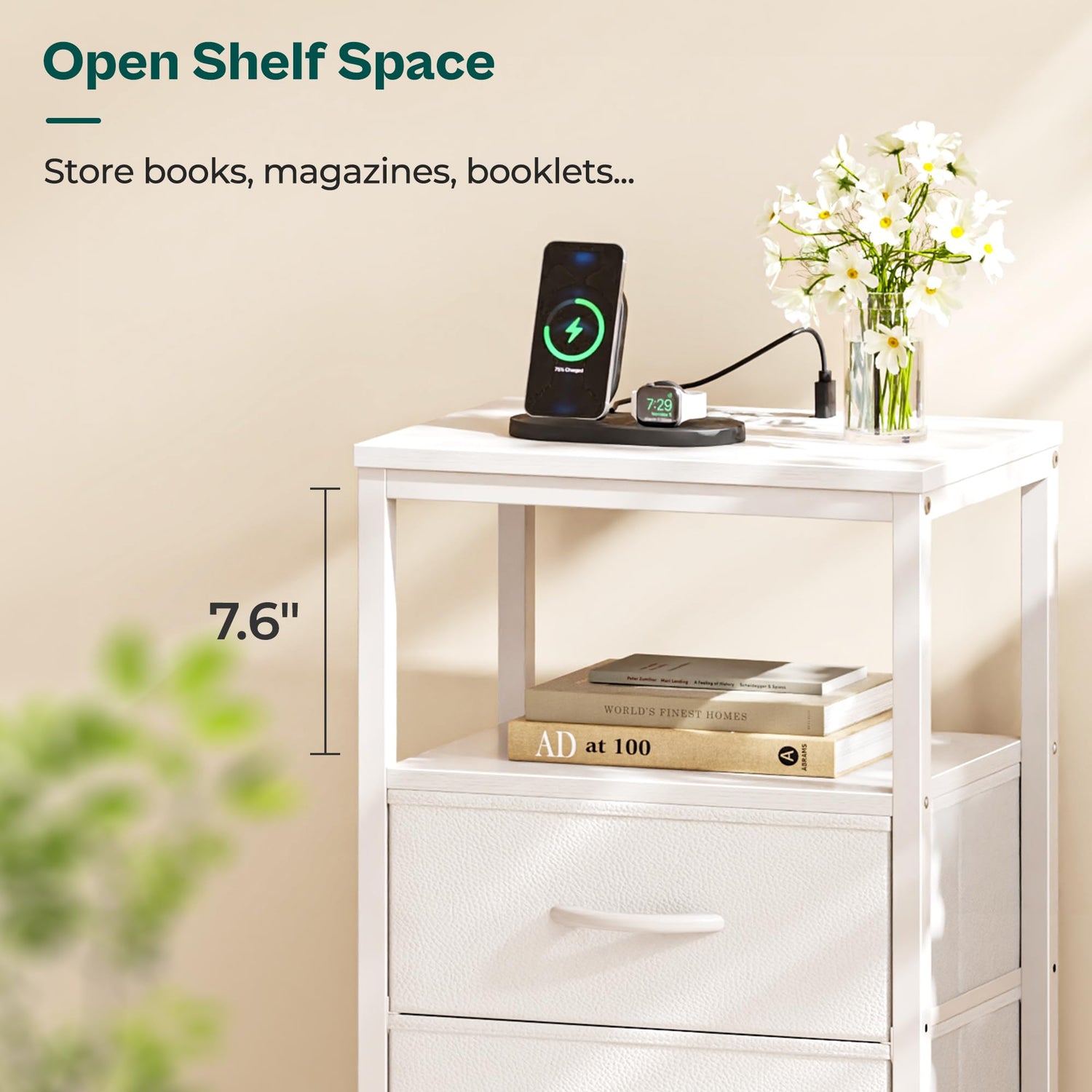 Huuger Nightstand with Charging Station, Side Table with Fabric Drawers, End Table with Open Shelf, Bedside Table with USB Ports and Outlets, Night Stand for Bedroom, White