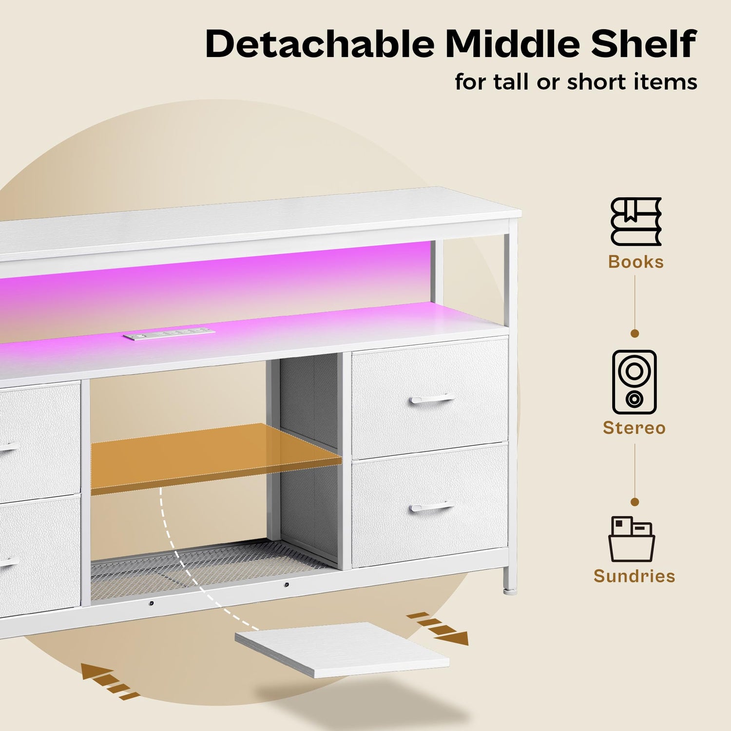 Huuger TV Stand Dresser with Power Outlets and LED Lights, 4 Drawers Entertainment Center with Shelves, 54 Inch Media Console for 55 60 Inch TV, 4 AC Outlets, 2 USBs, Dresser with PU Finish, White