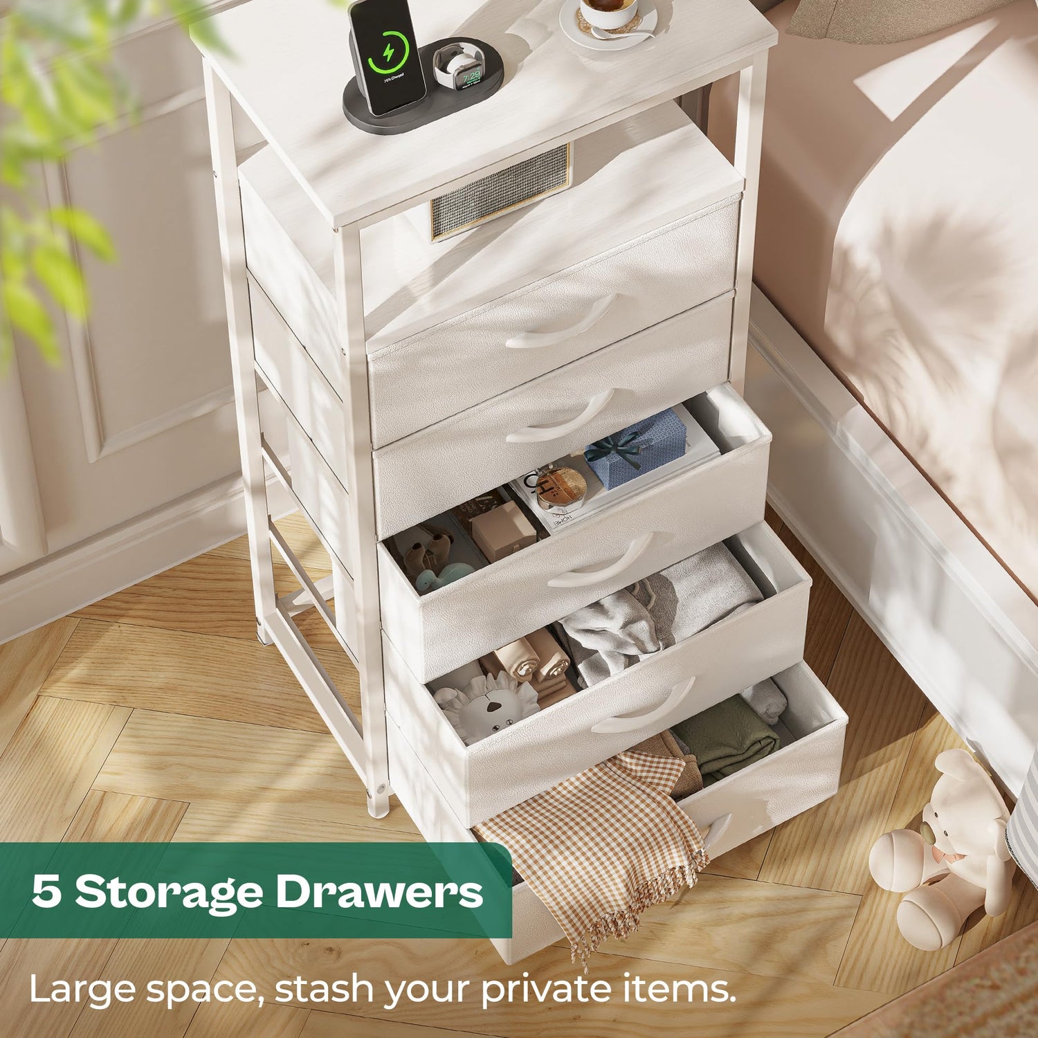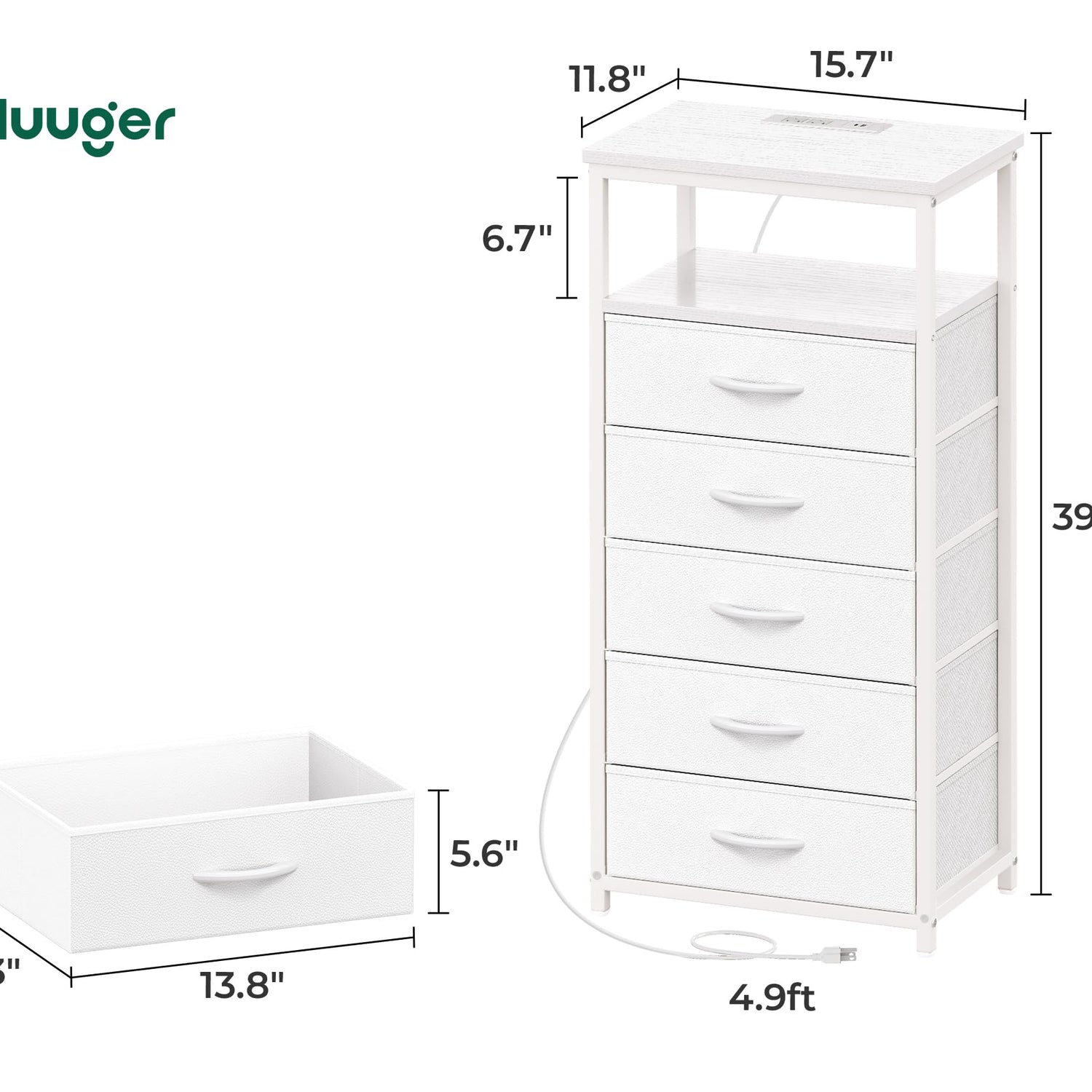 Huuger White Dresser with 5 Drawers & Charging Station, Tall Dresser for Bedroom, Tall Night Stand with PU Leather Finish, Open Shelf, Nightstand for Bedroom, Closet, Hallway, Entryway