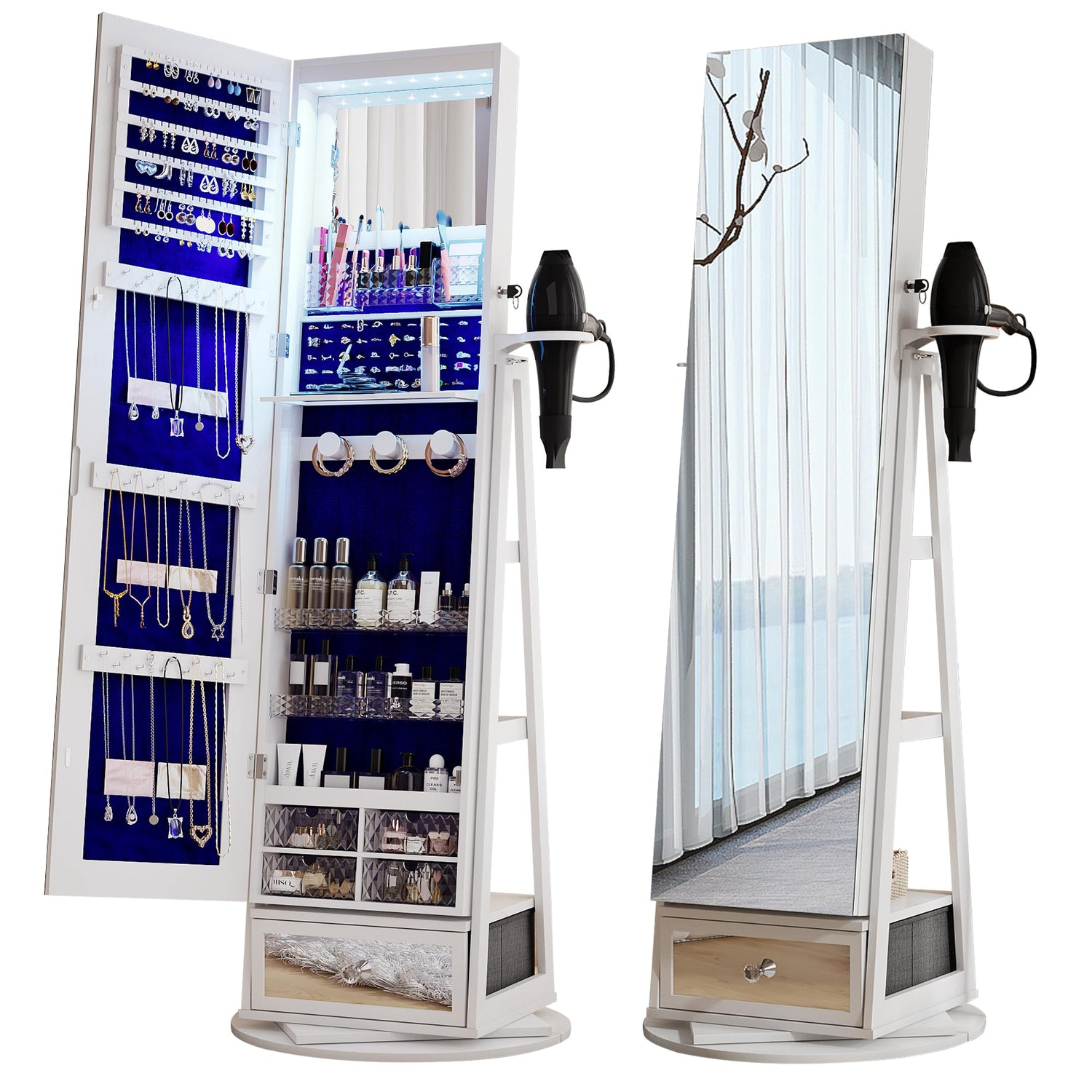HWB Full-Length Mirror with Jewelry Storage: 360° Swivel Standing Jewelry Cabinet with Lights - Rotatable Standing Jewelry Armoire Organizer with Foldable Makeup Shelf White