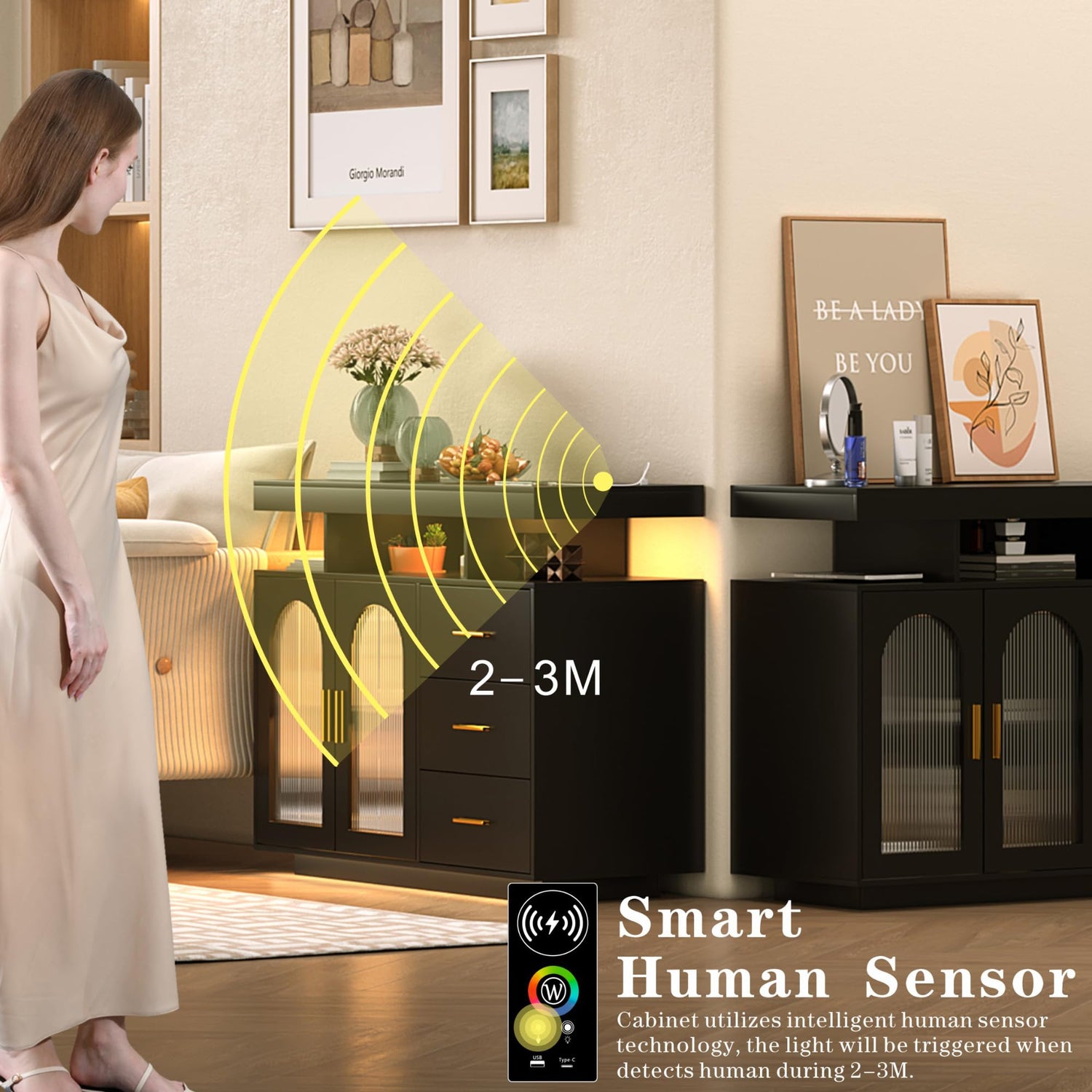 What sets this buffet cabinet apart is its innovative auto-sensor 20 LED lighting. With the ability to adjust the background colour to match your mood, the lights activate automatically when they detect movement within a 2-3 metre range and turn off after you leave, making it a convenient and energy-efficient addition for those late-night gatherings.