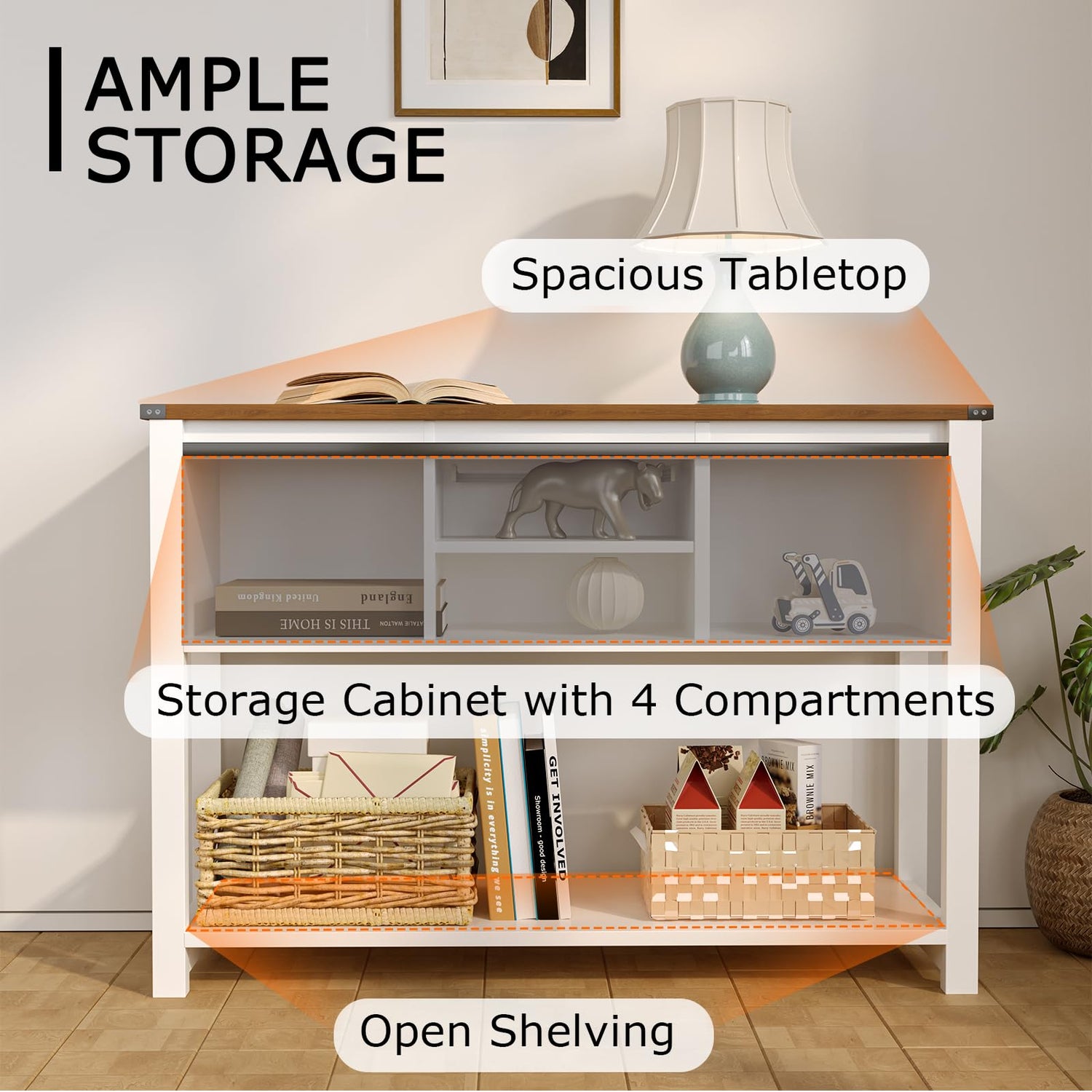 - Spacious Storage & Adjustable Shelves for Your Belongings: With a large 46"" W × 14"" D tabletop, this farmhouse end table offers ample space for decorations, keys, mail, and everyday items. The side cabinets and middle cubby feature removable and adjustable shelves, allowing you to customize the storage space to fit your needs. The fixed lower shelf is perfect for books, plants, or even a small coffee bar cabinet.