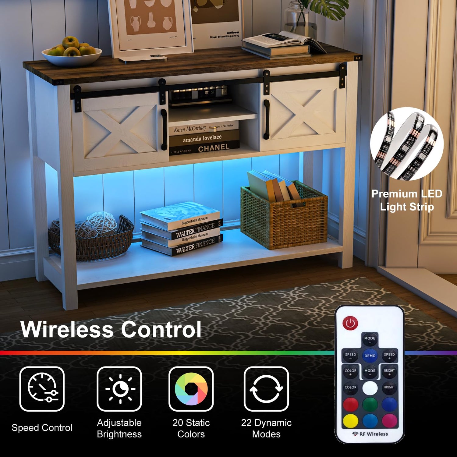 HXBOAUVS Farmhouse Entryway Table with LED Light, Sofa Table with Sliding Barn Door, Adjustable Open Shelves, 46" Rustic Console Table with Storage, Antique White Hallway for Living Room Bedroom